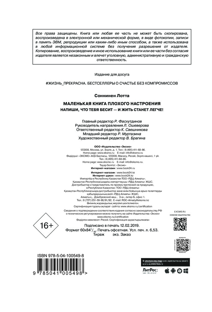 Серия: #жизнь_прекрасна Если вам надоело быть «позитивным», когда нервы буквально на пределе и все вокруг бесит, «Маленькая книга плохого настроения» — для вас! Лотта Соннинен собрала в ней десятки остроумных заданий, которые помогут выпустить пар и успокоиться, оставив все негативные эмоции на страницах. |