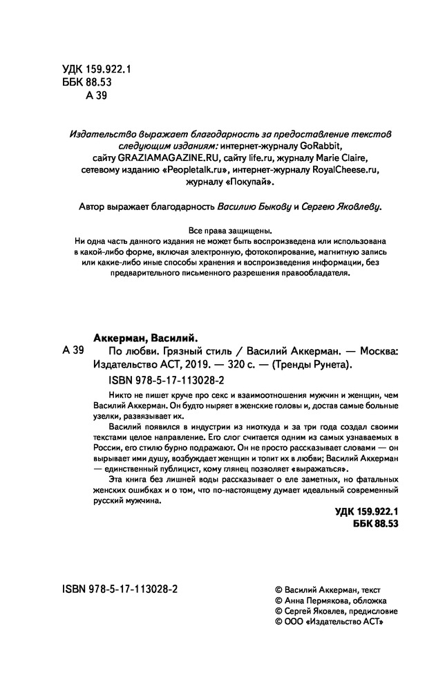 По любви. Грязный стильВ данный момент этот товар отсутствует в продаже. Возможно, у нас найдется аналогичный или похожий товар здесь. Серия: Тренды Рунета Никто не пишет круче про секс и взаимоотношения мужчин и женщин, чем Василий Аккерман. Он будто ныряет в женские головы и, достав самые больные узелки, развязывает их. |