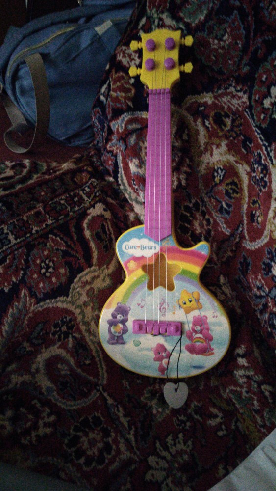 Думала детская, музыкальная гитара! Оказалось, что обычная, почти взрослая гитара со струнами) нужно быть аккуратнее, моя племяшка порезала пальчики этими струнами) а так, очень прикольная вещь, сама играет и смеется.