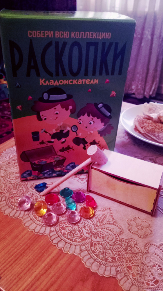 К доставке Флип претензий нет! Как всегда все на высоте, аккуратно упаковано, вовремя доставлено! А вот производитель реализует Брак! Набор пришел бракованный, некомплект. Причем и возврат не сделаешь..., пока дети разобрались с бруском, а только потом взялись за детали сундучка, выяснилось, что детали вложены были совершенно не комплект. Сундучок из них собрать невозможно. Брусок рекомендуют смачивать водой и подождать. Но даже выполнив рекомендации, брусок остался ужасно твердым. Вложенный стек оказался мягким пластиковым, им нереально было этот кирпич раздолбить. Применили свои средства, в результате найденные кристаллы были поцарапаны. Полное разочарование фирмой производителем и купленным набором!