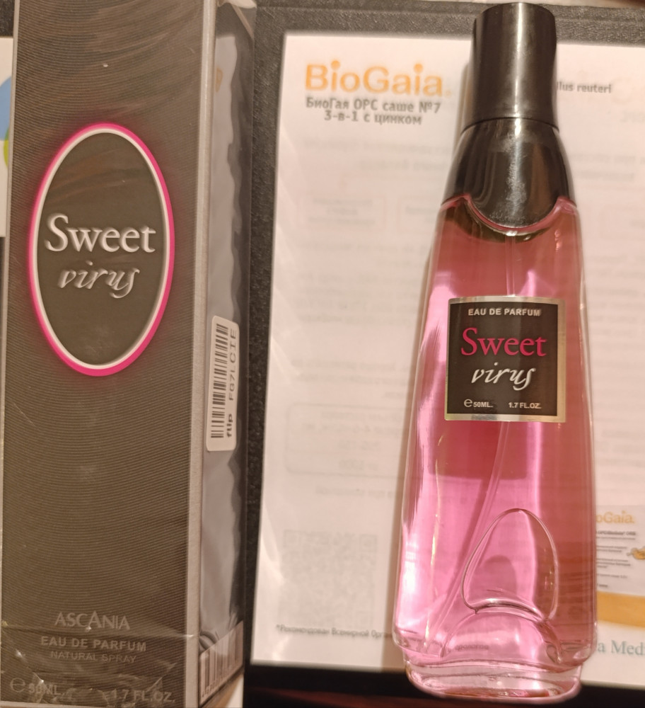 Парфюмированная вода «Sweet Virus». Покупала за 1500 т-ге, по скидке. Аромат в стиле Poison Girl. Сладкий, восточно-гурманский. Я чувствую розу и карамель. Спирт в первые минуты выветривается. Стойкость воды на одежде, около 2-х часов. Волосы пахнут дольше. Много плохих и хороших отзывов читала на этот парфюм. Мне понравился. Хотя, ничего оригинального. Есть похожие ароматы у Avon, с лучшей насыщенностью и стойкостью. Но у Ascania, цена — ниже некуда. Флакончик компактный, крышечка плотно сидит, удобно с собой в сумке носить.