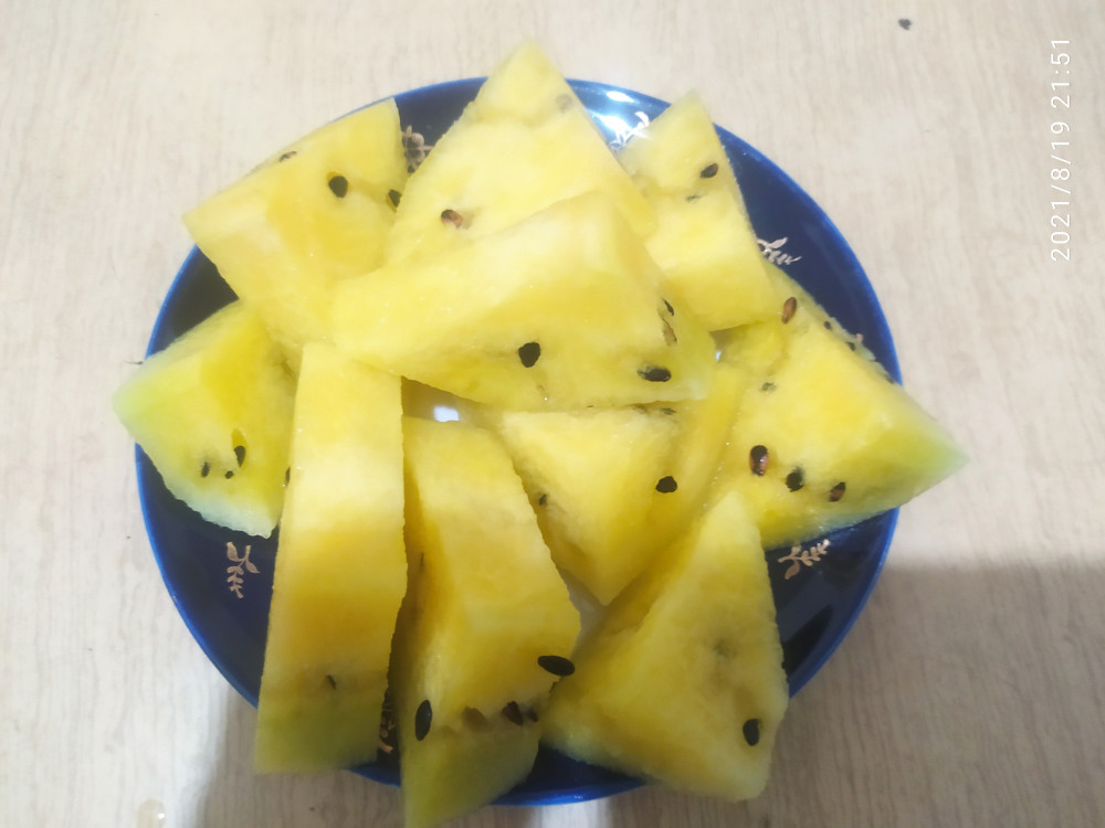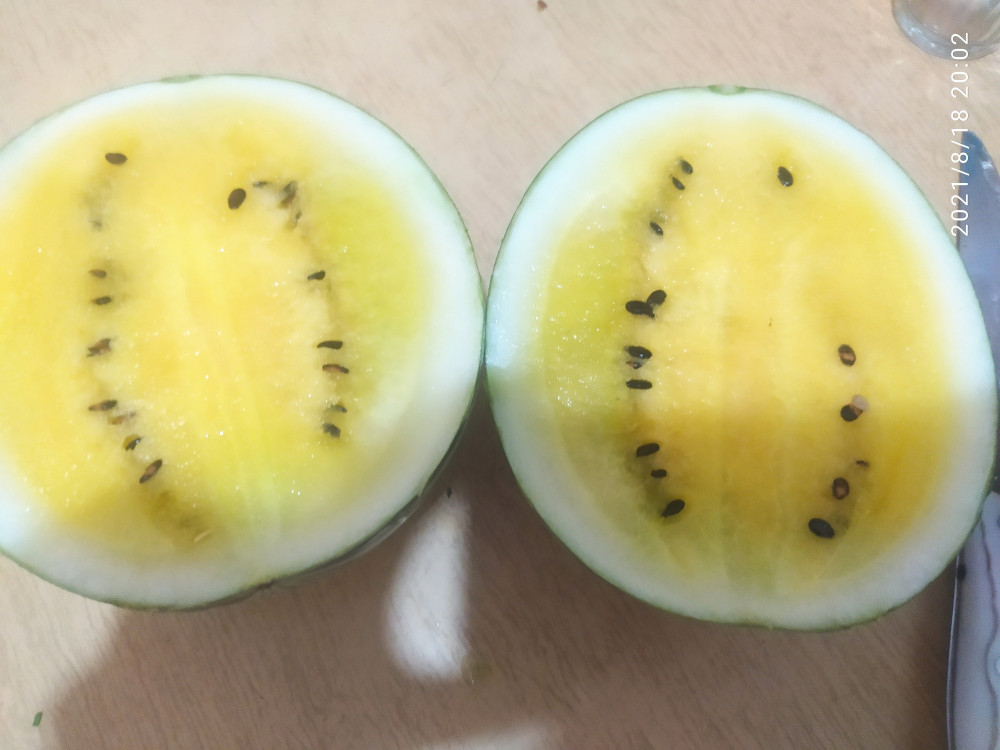 Из семи взошло три. Вырос один плод небольшого размера. По вкусу не очень, но зато собрал много семян. На следующий год посажу, так как жара была ранняя и возможно это повлияло на размер. Мякоть действительно желтая.