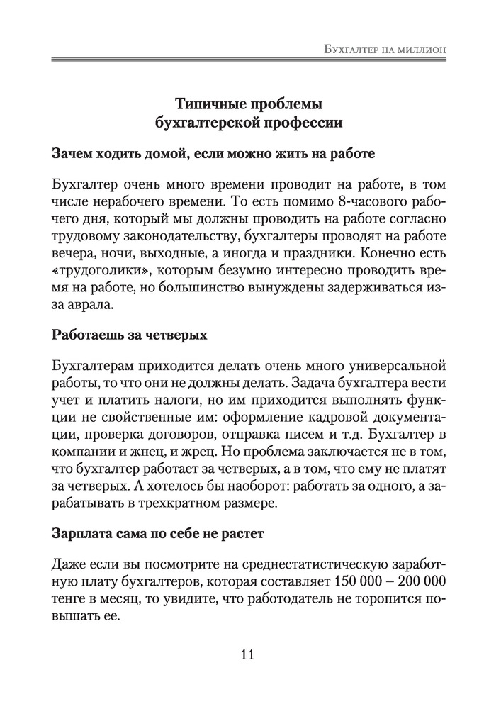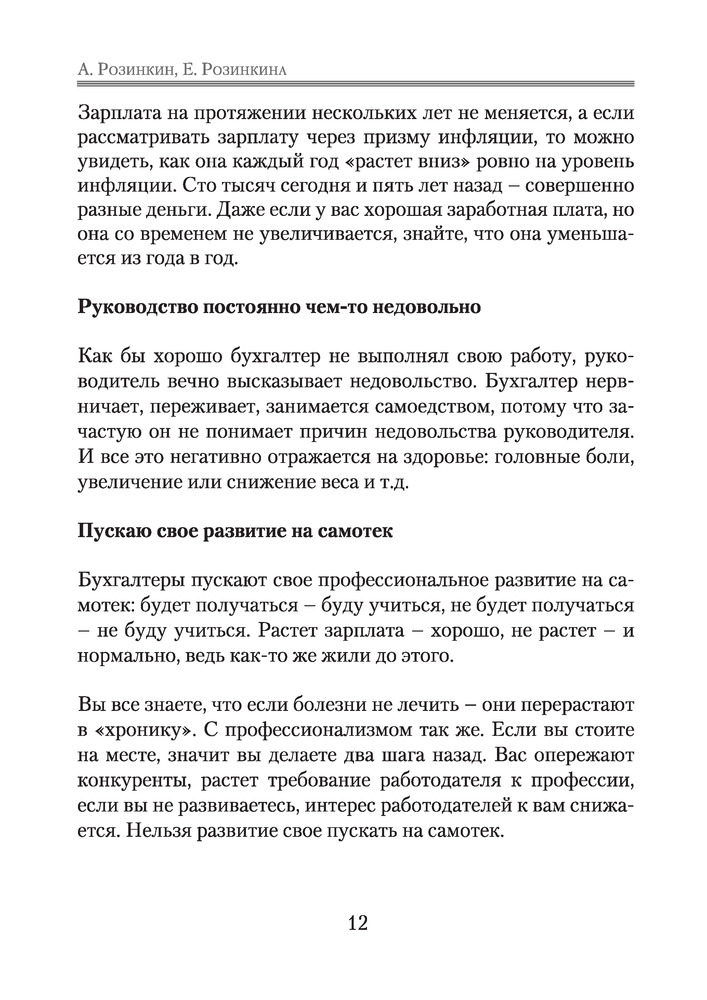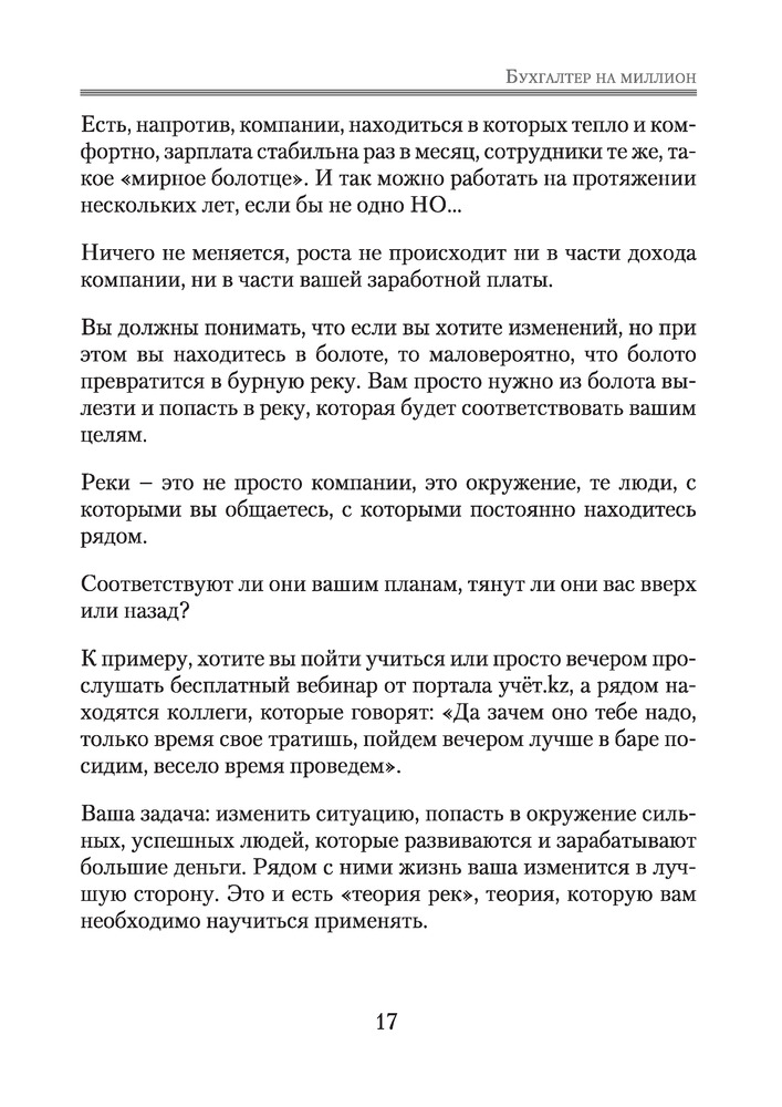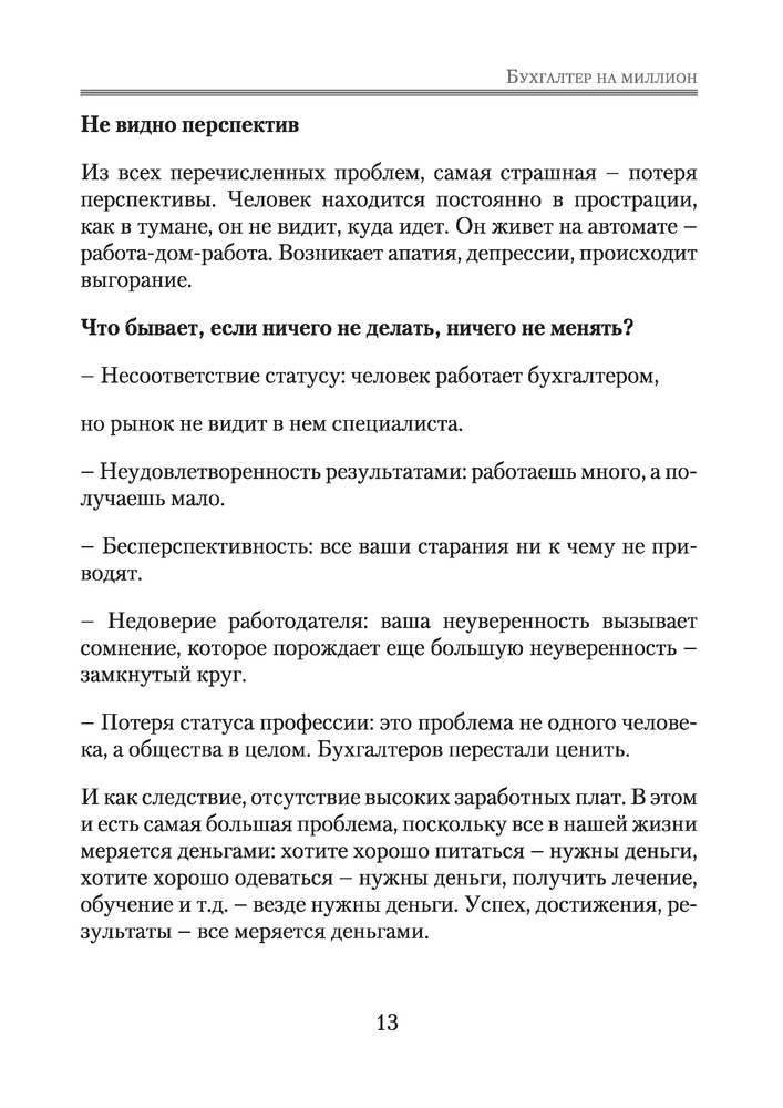 Читала отзывы перед покупкой и было не совсем понятно, что это за книга. Читается легко и быстро. Главные открытия для меня были про анализ рынка вакансий, что большие зарплаты платят не за сдачу ФНО, а за МСФО и навыки руководителя. Я поняла - как важно работать над своей самооценкой и вся глава по упаковке - это то, о чем я никогда не задумывалась, а зря. Книга полезна тем, что в ней понятно написано то, о чем в бухгалтерии мне никогда никто не рассказывал - как вытащить себя из стресса и текучки и зарабатывать больше. :)