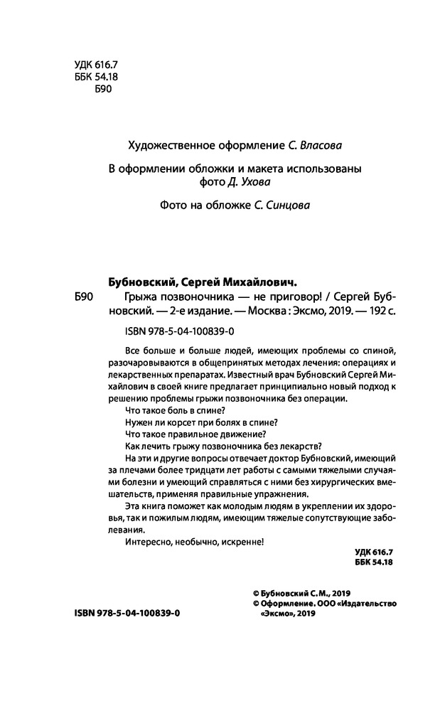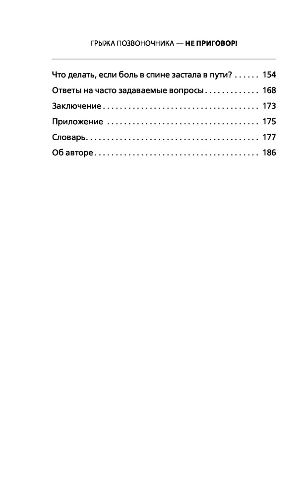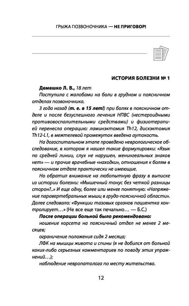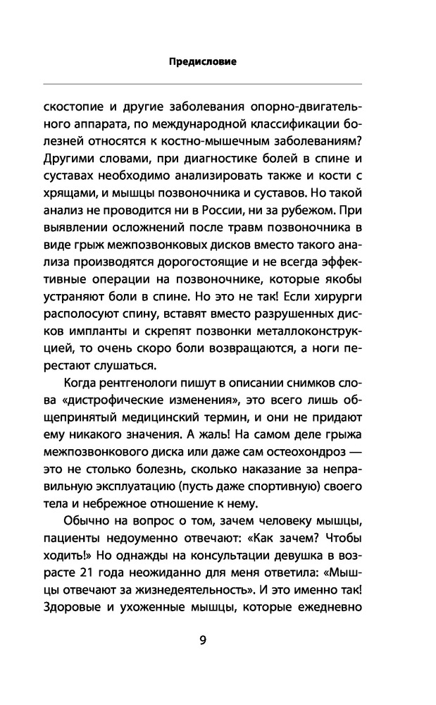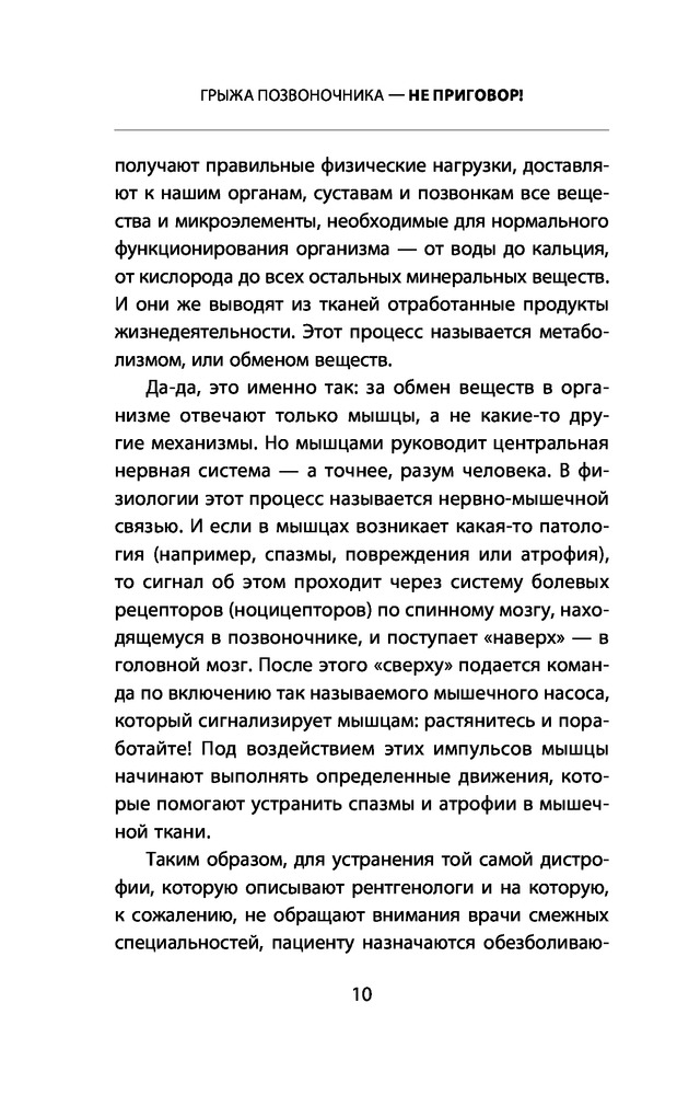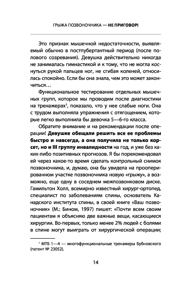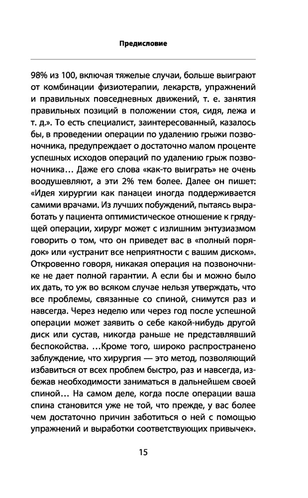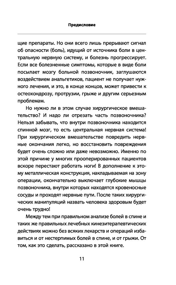 удобная для чтения по шрифту букв. приводимые примеры и описанию полезны. Предлагали операцию много лет назад я отказалась . Не зная вашу методику делаю много лет лёгкую зарядку для позвоночника и была права. Нашла в вашей книге какие ещё нужно делать упражнения. Буду продолжать делать . Так как в операции не нуждаюсь. конечно очень утром тяжело вставать но после зарядке становиться на много лучше и я спокойно могу нагибаться и разбираться без болей. Спасибо за книгу.