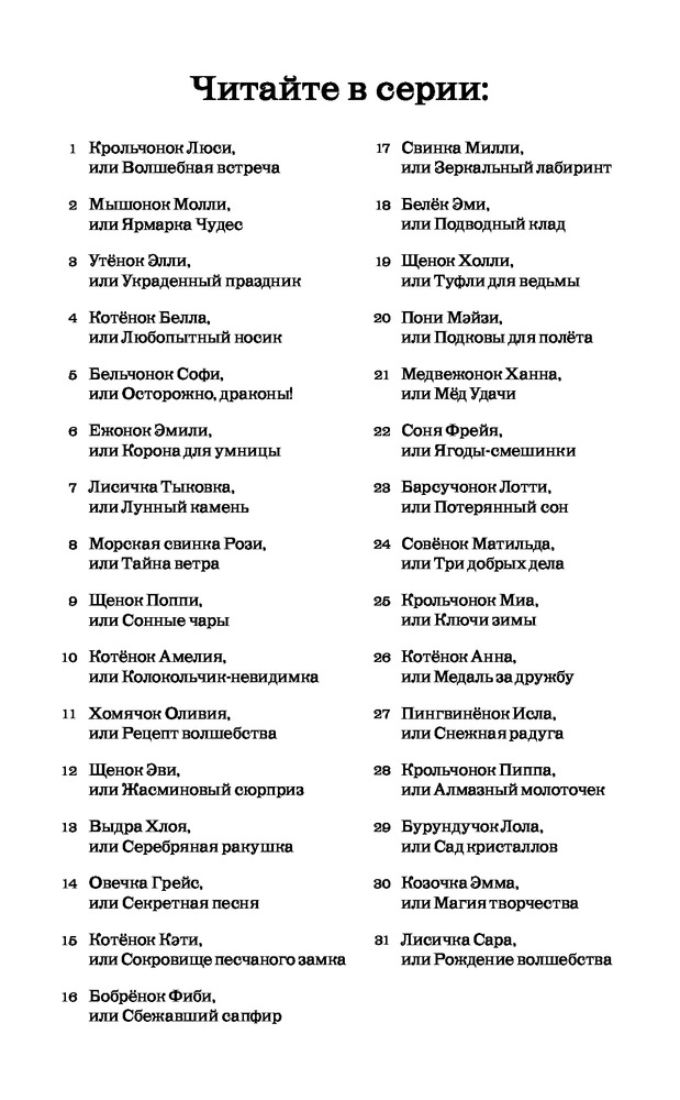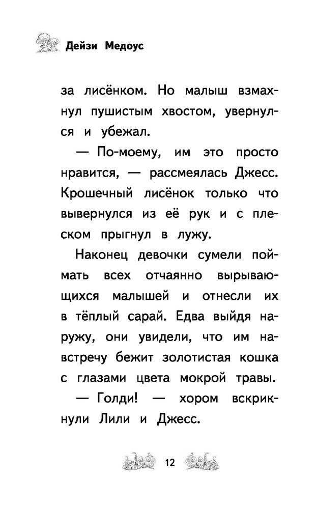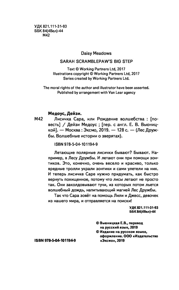 Лисичка Сара, или Рождение волшебстваВ данный момент этот товар отсутствует в продаже. Возможно, у нас найдется аналогичный или похожий товар здесь. Серия: Лес Дружбы. Волшебные истории о зверятах Летающие полярные лисички бывают? Бывают. Например, в Лесу Дружбы. И летают они при помощи зонтиков. Это, конечно, очень весело и красиво, только вредные тролли украли зонтики и сами улетели на них. И теперь лисичке Саре нужно придумать, как быстро вернуть похищенное, потому что лисы летают не просто так. Они заколдовывают тучи, из которых потом льется волшебный дождь, напитывающий магией Лес Дружбы.Так что Сара зовёт на помощь Лили и Джесс, девочек из нашего мира, и отправляется на поиски! |