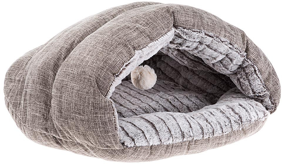С внешней стороны пещерка имеет обивку из плотной ткани с груботканной фактурой. Ткань практичная и не маркая. Внутри очень мягкий приятный искусственный мех с коротким ворсом. Аксессуар имеет небольшой вес и не занимает много места. Подходит для машинной стирки при t 30°C. Частые стирки не влияют на качество лежака — мех не слеживается и остается таким же мягким и пушистым, а ткань не линяет и дает усадку.
