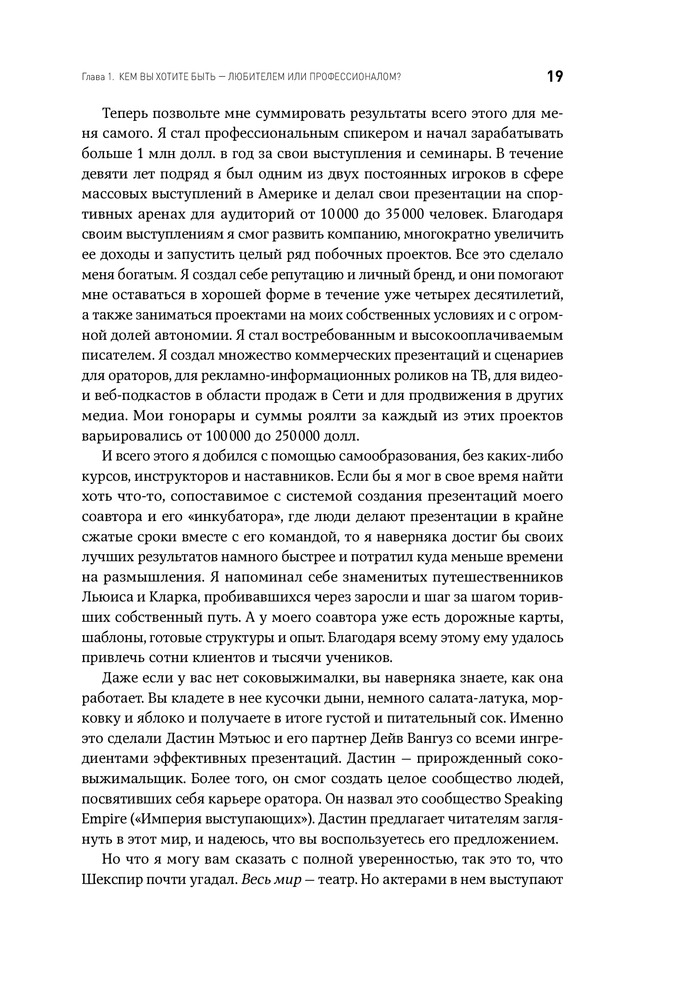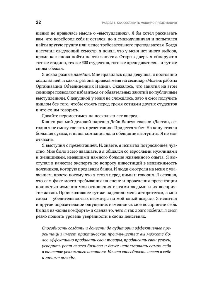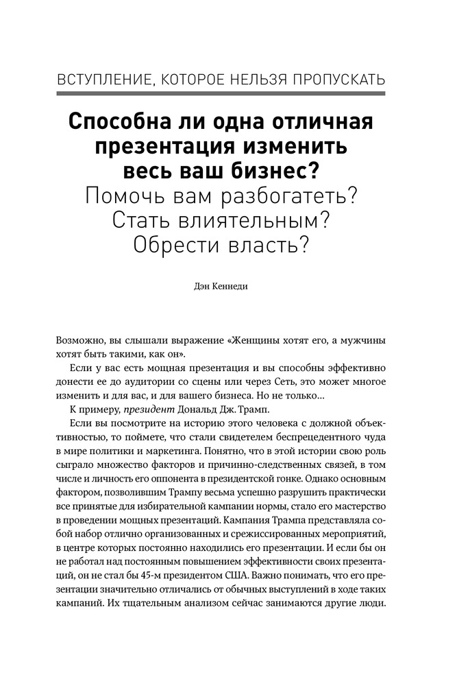Отличная книга, использовал на практике и действительно презентация поменялась в целом. Как и само содержание и подача, рекомендую прочесть все книги автора если вы хотите добавиться успеха. Действительно если перед Вами важный проект, встреча, переговоры, презентация продукта и даже привлечения инвестиции то это книга стоит того времени и денег чтоб потратить. Уверен что время от времени буду возвращаться к данной книге перед важными переговорами.