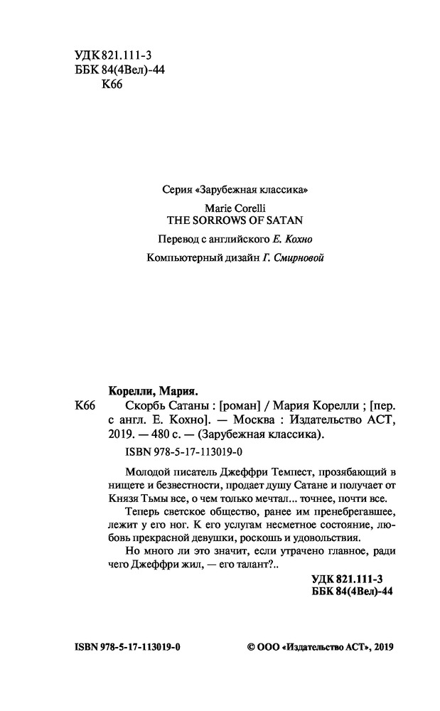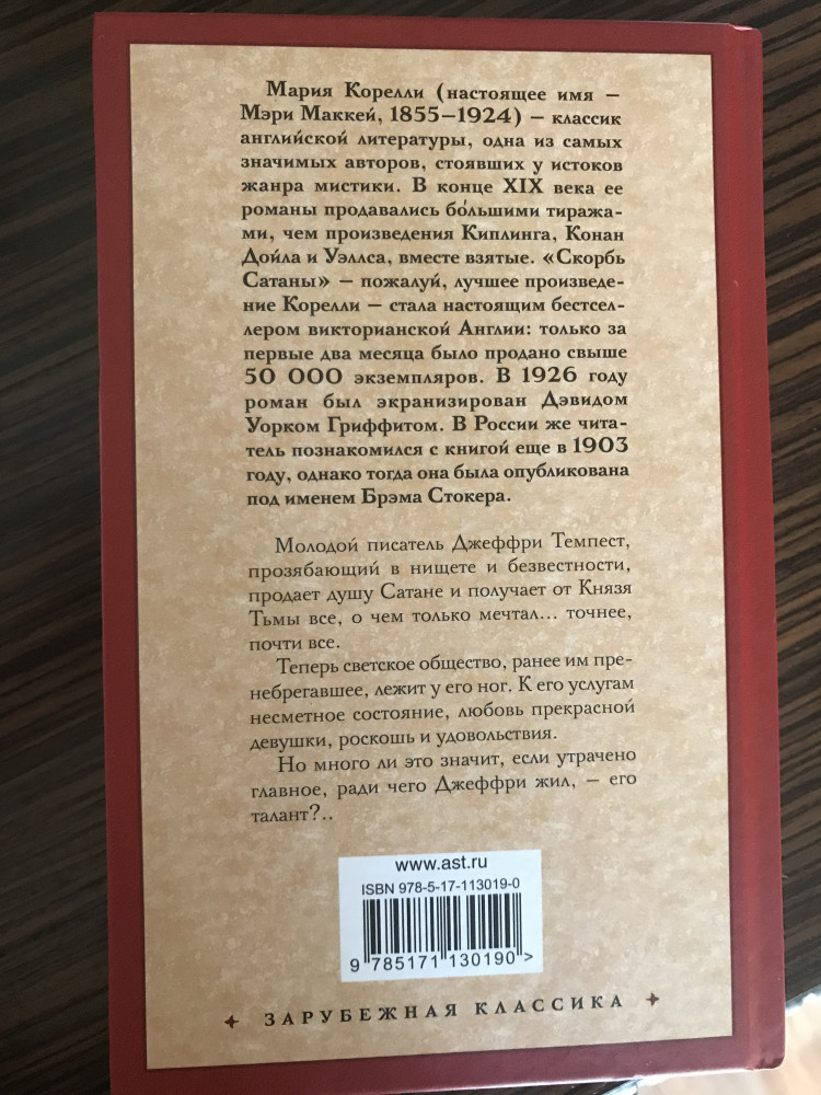 Наконец издали эту книгу, очень давно её не было, нельзя было достать. Это замечательный роман с элементами мистики! Изобличает пороки общества - чем немного напомнил "Портрет Дориана Грея". Лючио Риманец великолепен - читала, не отрываясь) Сам Князь тьмы оказался достойнее некоторых людей. По поводу оформления - шрифт хороший, не мелкий, твёрдая обложка, бумага серая.