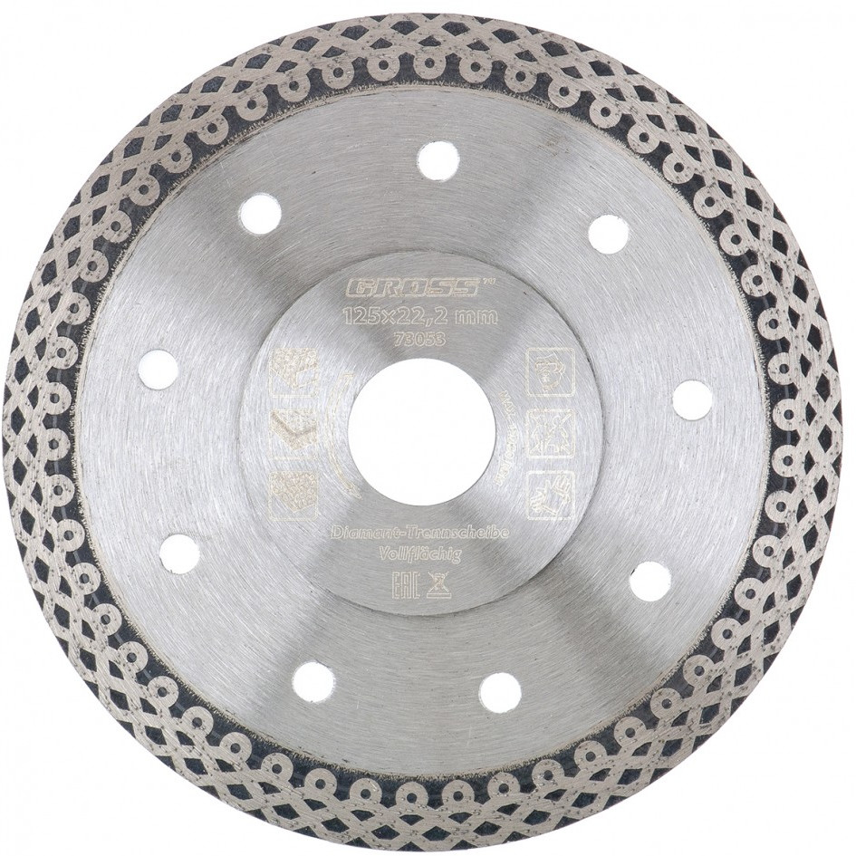 Диск предназначен для сухого и мокрого резания, керамической плитки, керамогранита, природного камня. На основание из стали 65Г, методом горячего прессования, нанесён режущий слой, состоящий из порошков различных металлов и высококачественного синтетического алмаза. Сплошной режущий слой, позволяет получить чистые, ровные края без сколов и трещин.