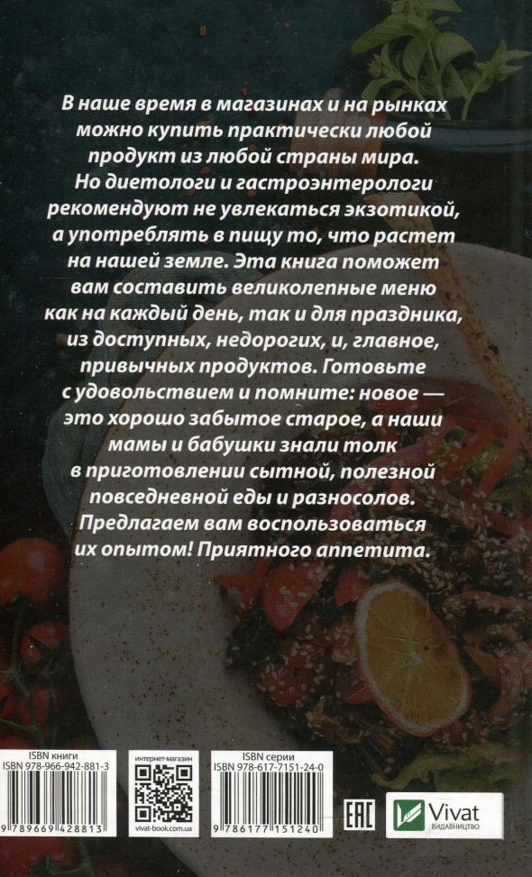 Кулинарные хиты из доступных продуктовВ данный момент этот товар отсутствует в продаже. Возможно, у нас найдется аналогичный или похожий товар здесь. Серия: Полезная книга В наше время в магазинах и на рынках можно купить практически любой продукт из любой страны мира. Но диетологи и гастроэнтерологи рекомендуют не увлекаться экзотикой, а употреблять в пищу то, что растет на нашей земле. Эта книга поможет вам составить великолепные меню как на каждый день, так и для праздника, из доступных, недорогих, и, главное, привычных продуктов. Готовьте с удовольствием и помните: новое — это хорошо забытое старое, а наши мамы и бабушки знали толк в приготовлении сытной, полезной повседневной еды и разносолов. Предлагаем вам воспользоваться их опытом! Приятного аппетита. |