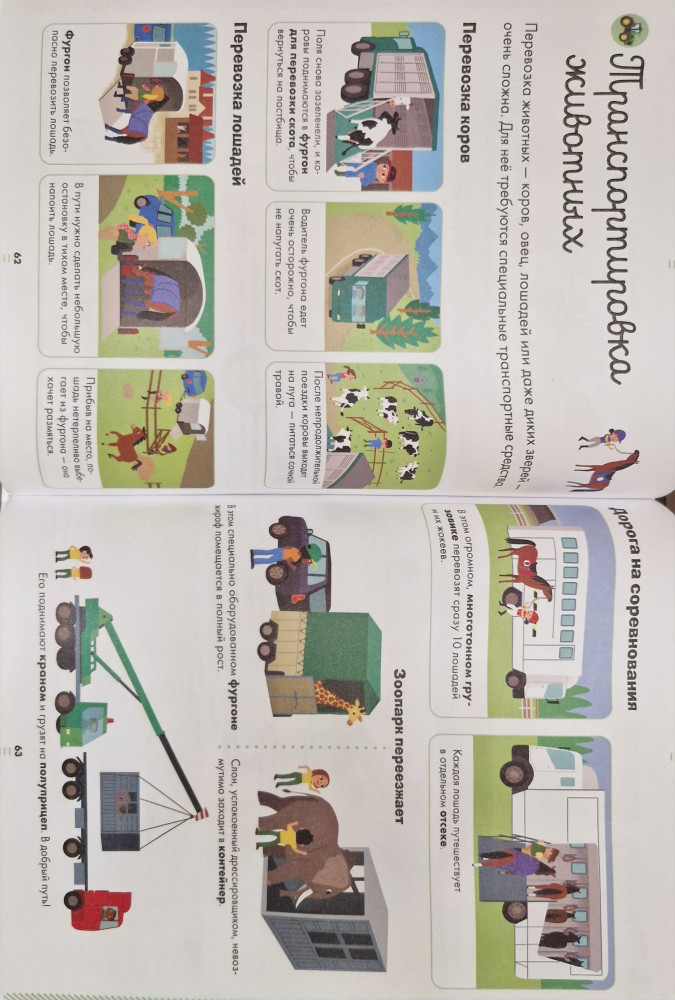 Брала книгу четырехлетнему сыну. Ему очень понравилась. Очень много различного транспорта указано и рассказано про него. Моего, правда, пока интересуют исключительно машины: грузовики и легковые, заинтересовался спец.техникой. Книга мне понравилась: * качество страниц - достаточно плотные; * указан определенный вид транспорта, начиная с гужевых повозок, и хорошо про него расписано Я много просмотрела книг про транспорт для своего малолетнего и эта оказалась самым удачным вариантом в соотношении: объем информации + техника передачи информации + качество книги. Однозначно рекомендую.