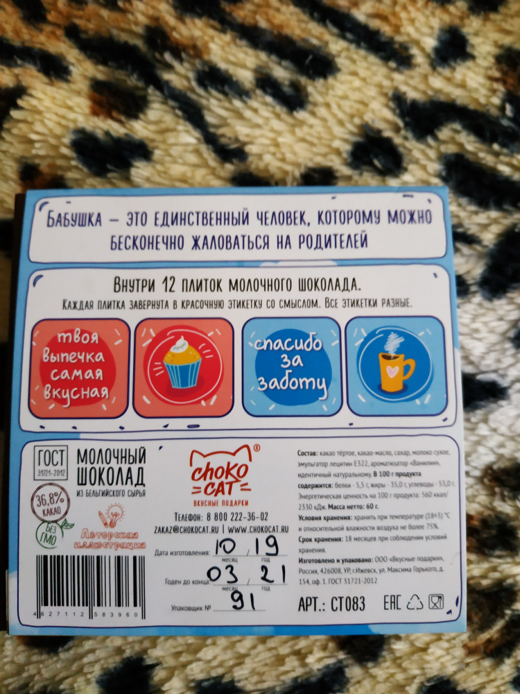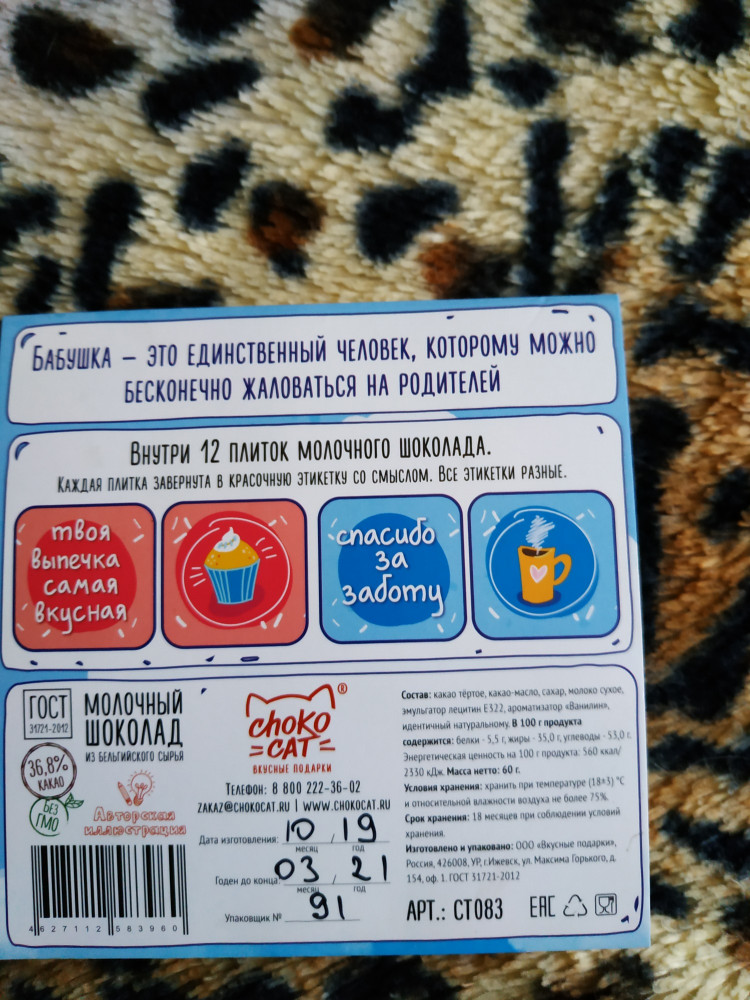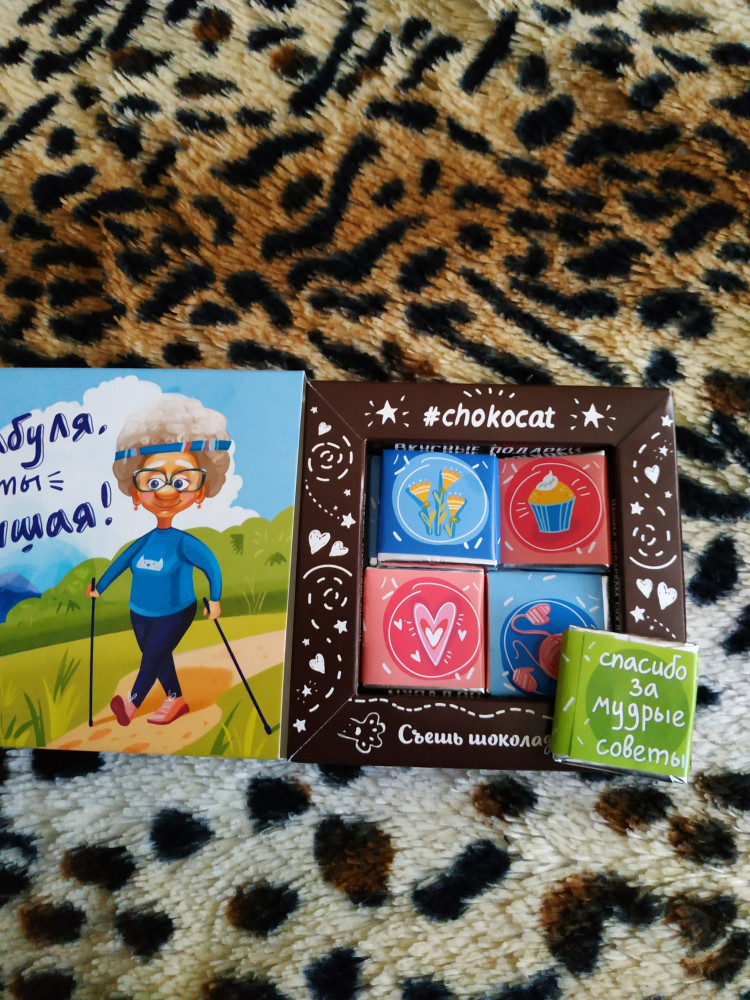 Прикольная коробочка, но слишком уж маленькая по такой цене. На каждой шоколаде комплимент для бабушки. Как шоколад на вкус не знаю. Но думаю, бабушкам было приятно.