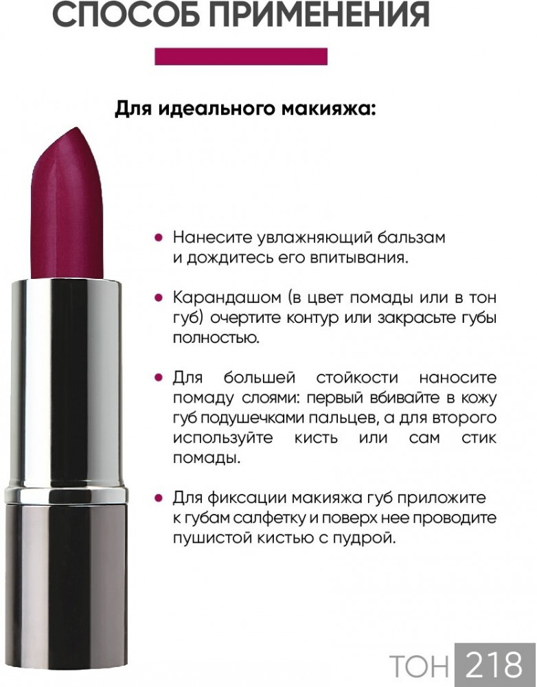 помада понравилась! качество, оформление, то, как на губах ощущается. НО, цветовая гамма по факту далека от того, что заявлено на сайте!