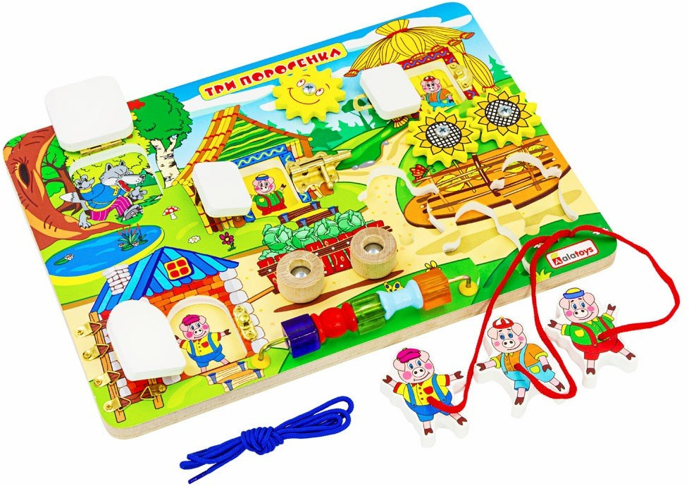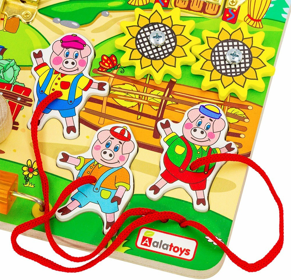 Alatoys Бизиборд «Три поросенка»В данный момент этот товар отсутствует в продаже. Возможно, у нас найдется аналогичный или похожий товар здесь. Бизиборд — это развивающая доска (стационарная или мобильная) с закрепленными на ней предметами, которые обычно интересуют малышей в доме. Ребенок познает принцип действия многих вещей из жизни взрослого человека. При этом игра не представляет опасности и увлекает детей на продолжительное время. |