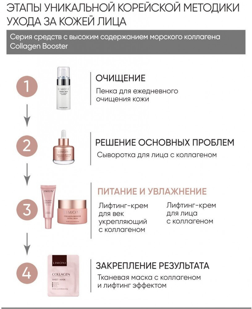 💳 Оплатить за товар можно при получении 🇰🇿 Есть бесплатная доставка по Казахстану от 1 дня 🎁 Копите бонусы с каждой покупки Серия: Collagen booster Крем содержит морской коллаген, который оказывает выраженный лифтинговый эффект, разглаживает морщины и стимулирует выработку собственного коллагена в коже. Защищает кожу от свободных радикалов и агрессивных факторов окружающей среды,предотвращает появление морщин. Осветляет пигментацию и защищает от образования пигментных пятен. Крем также содержит аденозин, ингредиент, оказывающий мощное антивозрастное действие, и активно разглаживающий мимические морщины в области лба, носогубных складок, в уголках глаз и губ. |