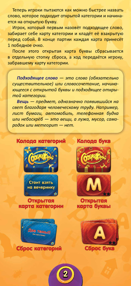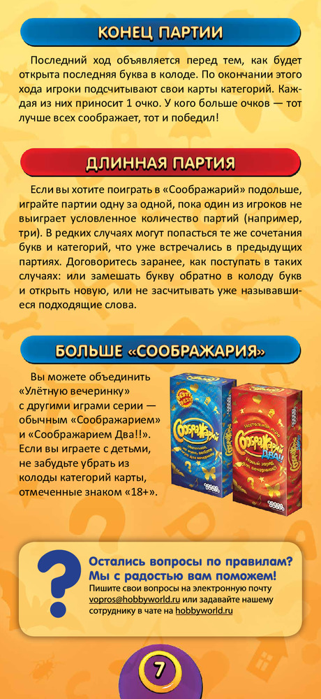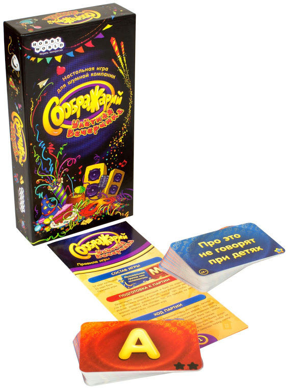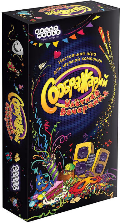 «Соображарий»« — увлекательная игра для самых быстрых, сообразительных и находчивых. Издание «Улётная вечеринка» рассчитано на шумные компании без зануд! Всегда помните: чтобы победить, не требуется быть самым эрудированным — нужно быстрее всех соображать и уметь веселиться!