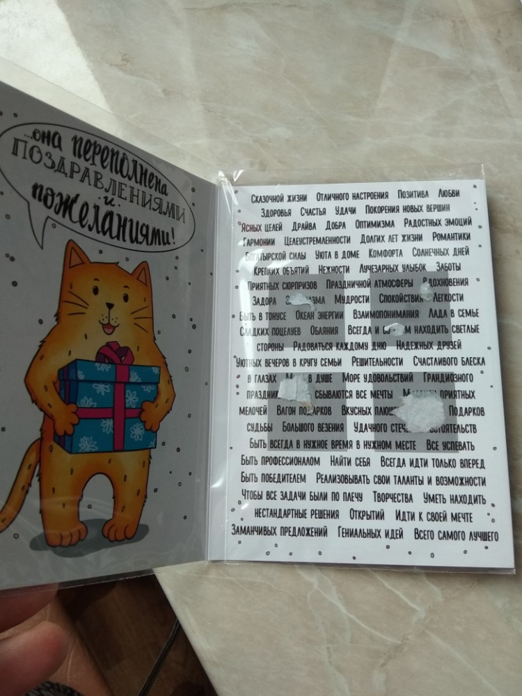 открытка дочери понравилась. все пожелания на открытке разные ни одного одинакового. единственное замечание производителю, нужно было хорошо продумать крепление шоколадок. после их отклеивания остаются следы.это не красиво . моя дочь немного расстроена. она хранит все свои открытки. а эта выглядит теперь испорченной. вообщем задумка хорошая,но не доработана!