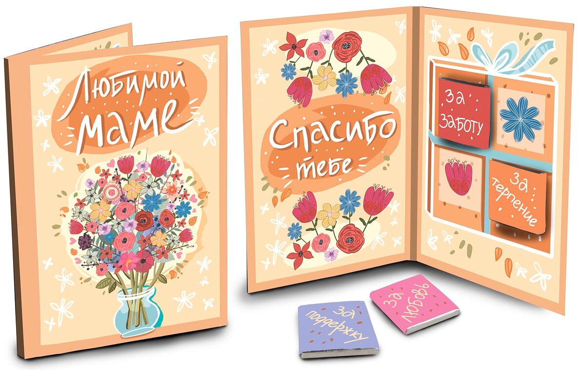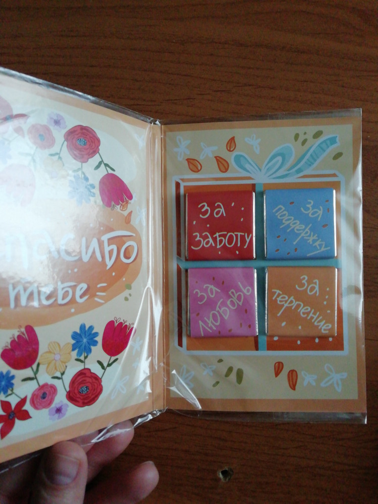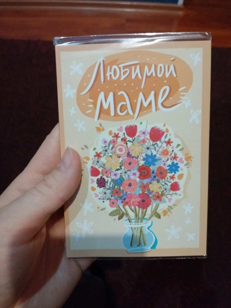 Оригинальная открытка. Заказывала маме на день рождения. Ей было очень приятно. Такие тёплые слова... и очень вкусный шоколад. Спасибо, Flip!