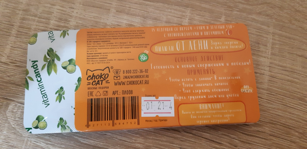 ChokoCat Леденцы «От лени»В данный момент этот товар отсутствует в продаже. Возможно, у нас найдется аналогичный или похожий товар здесь. Серия: Пилюли Энергия для свершений в твоих руках. Пилюли со вкусом лайма и зеленого чая. С витамином С и антиоксидантами. Без сахара! |