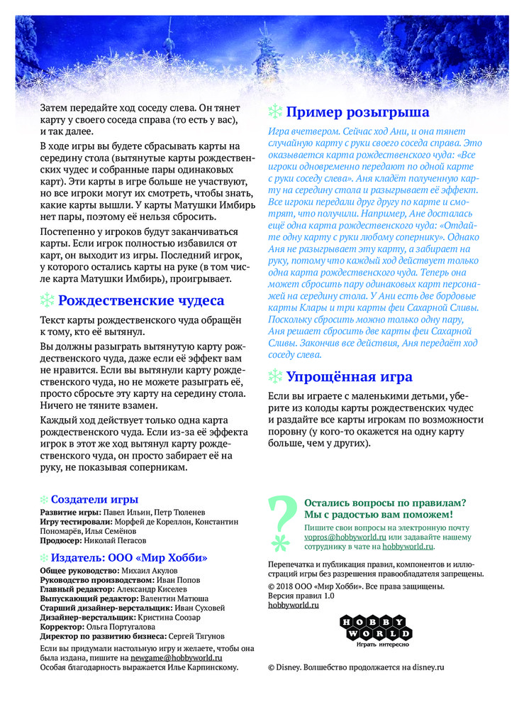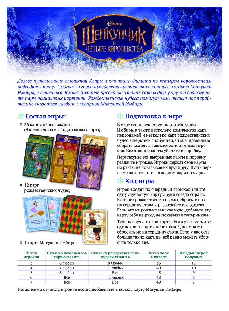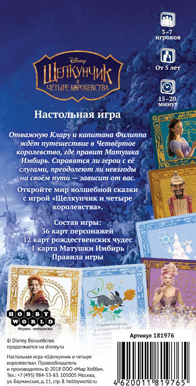 Hobby World Игра настольная «Щелкунчик и четыре королевства»В данный момент этот товар отсутствует в продаже. Возможно, у нас найдется аналогичный или похожий товар здесь. Серия: Disney Отважную Клару и капитана Филиппа ждёт путешествие в Четвёртое королевство, где правит Матушка Имбирь. Справятся ли герои с её слугами, преодолеют ли невзгоды на своём пути — зависит от вас. |
