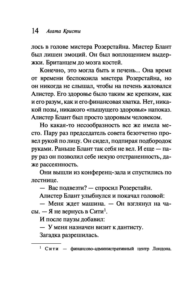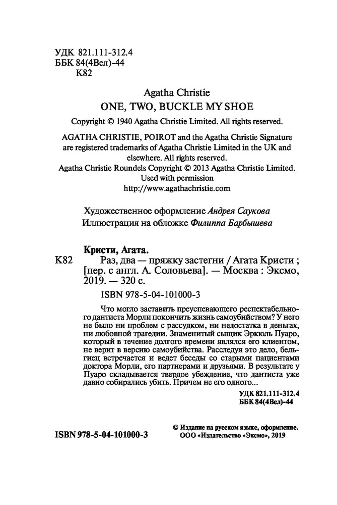 Раз, два - пряжку застегниинтересный сюжет мягкий переплёт хорошее состояние В данный момент этот товар отсутствует в продаже. Возможно, у нас найдется аналогичный или похожий товар здесь. Серия: Агата Кристи. Любимая коллекция Что могло заставить преуспевающего респектабельного дантиста Морли покончить жизнь самоубийством? У него не было ни проблем с рассудком, ни недостатка в деньгах, ни любовной трагедии. Знаменитый сыщик Эркюль Пуаро, который в течение долгого времени являлся его клиентом, не верит в версию самоубийства. Расследуя это дело, бельгиец встречается и ведет беседы со старыми пациентами доктора Морли, его партнерами и друзьями. В результате у Пуаро складывается твердое убеждение, что дантиста уже давно собирались убить. Причем не его одного... |