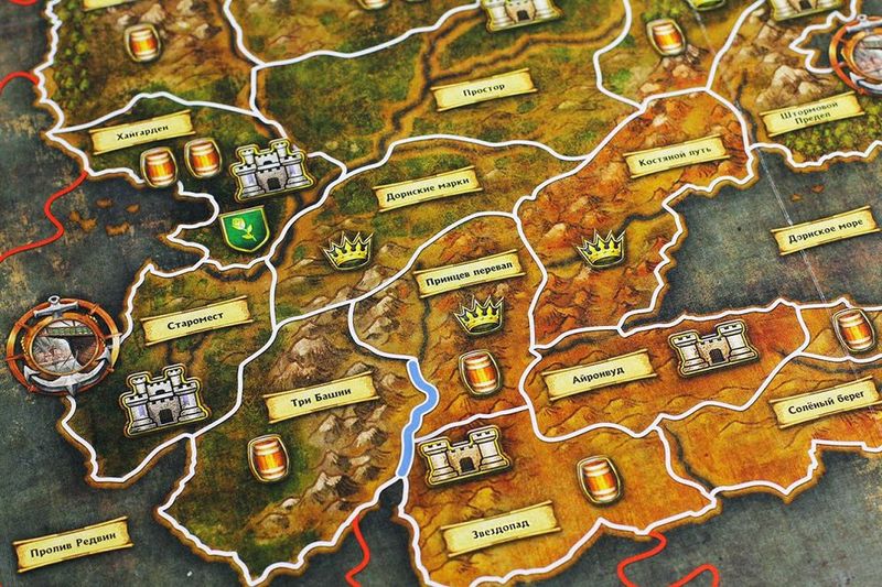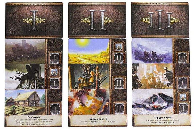 Довольно сложная игра, где нужно учитывать все факторы, планировать действия заранее, но быть готовым к тому, что соперники могут их испортить в последний момент! Заключайте недолгие союзы (конечно, только пока они вам выгодны), захватывайте замки бывших союзников, но будьте готовы, что и другие вам отплатят той же монетой! Интереснее всего играть впятером или вшестером. А если возьмете еще и дополнение "Мать драконов", то механика игры и состав фракций очень сильно поменяется. Остальные дополнения (Пир воронов, Танец с драконами) сильно не меняют механику, только вводят новых персонажей и дают альтернативные раскладки.