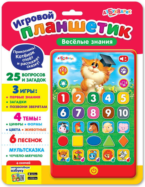 Азбукварик Игрушка развивающая «Весёлые знания»В данный момент этот товар отсутствует в продаже. Возможно, у нас найдется аналогичный или похожий товар здесь. Серия: Игровой планшетик Этот компактный игровой планшетик прекрасно подойдет для всестороннего развития вашего ребенка! 4 обучающие темы (цифры, формы, цвета, животные), 3 игры, 25 вопросов и загадок, 6 песенок и мультсказка «Чучело-мяучело» — всё это поможет провести время весело и с пользой! |