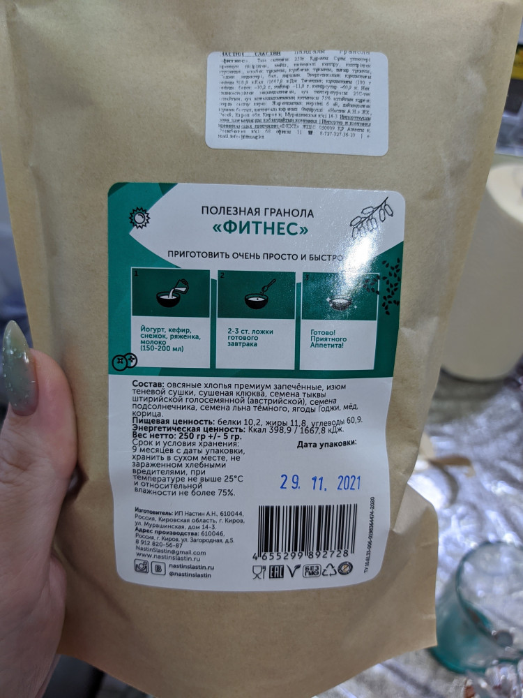 Гранола очень вкусная. На завтрак с кефиром просто супер!!!