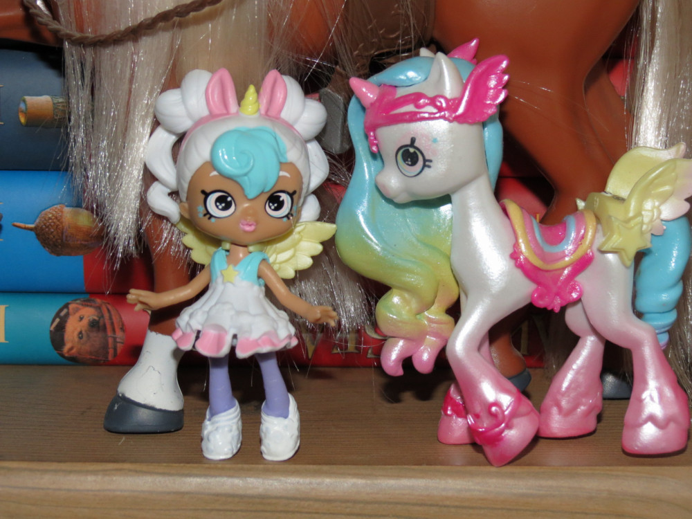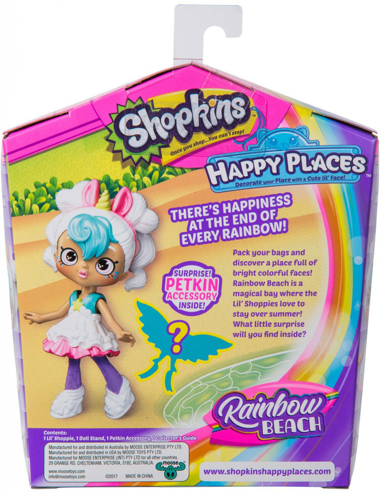 Набор с куклой Shoppie «Мистабелла» из нового 5 сезона «Happy Places» Shopkins на тему «Радужный берег» состоит из симпатичной куклы, подставки для нее и одной секретной фигурки «Petkins».