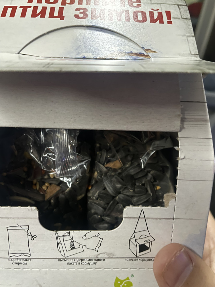 Упаковка кажется ненадежной для снега и дождя, поэтому обклеила скотчем, 4 месяца висит все в порядке. Птички кажется с неохотой едят мелкий корм.