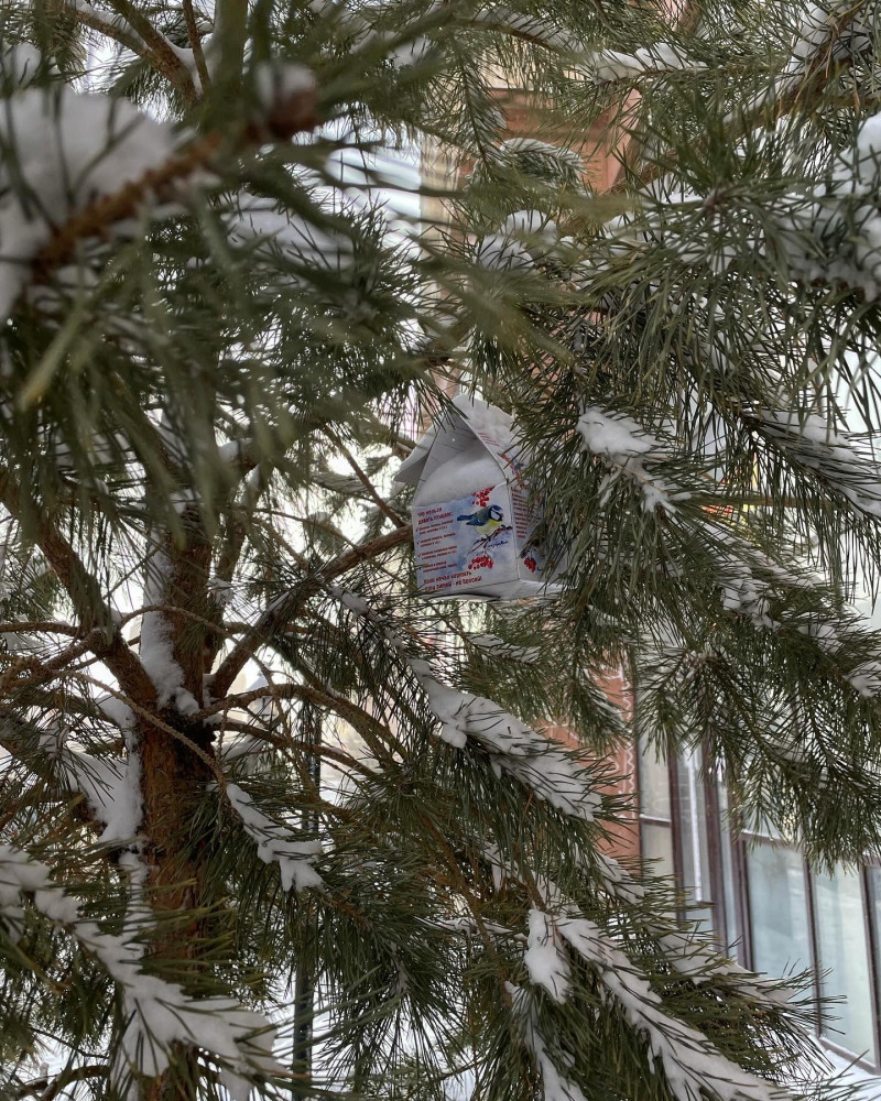 картон скотчем клеила, чтобы от снега не развалился. птички залетают.так отличная поделка...