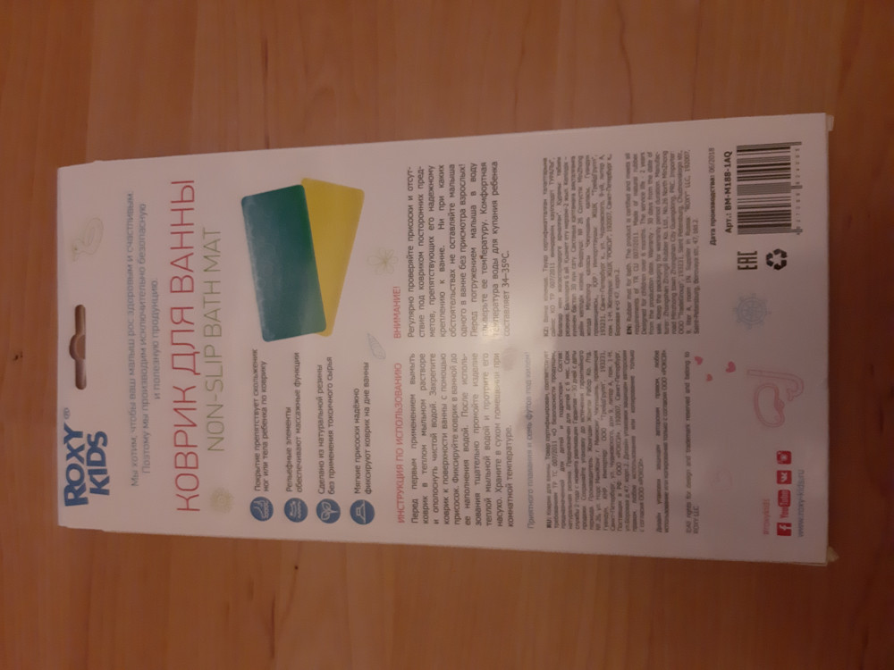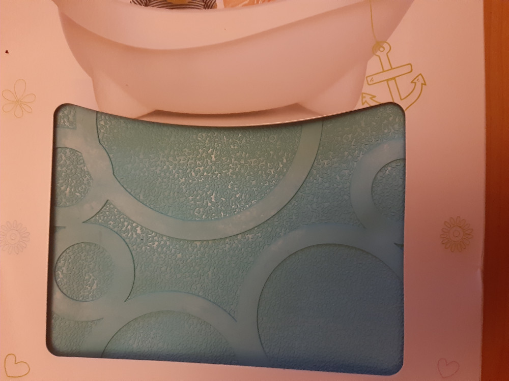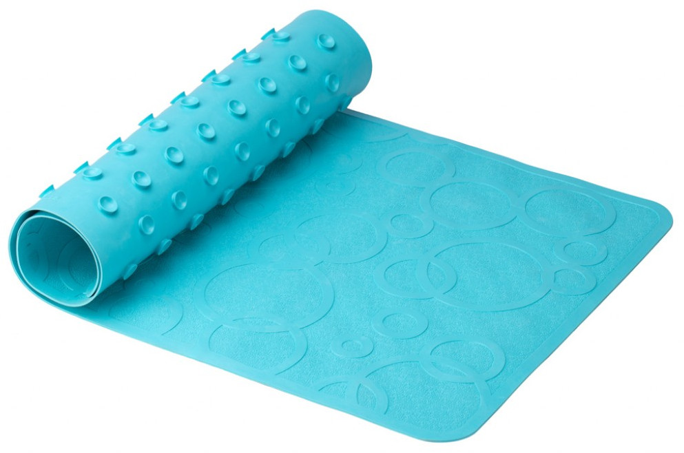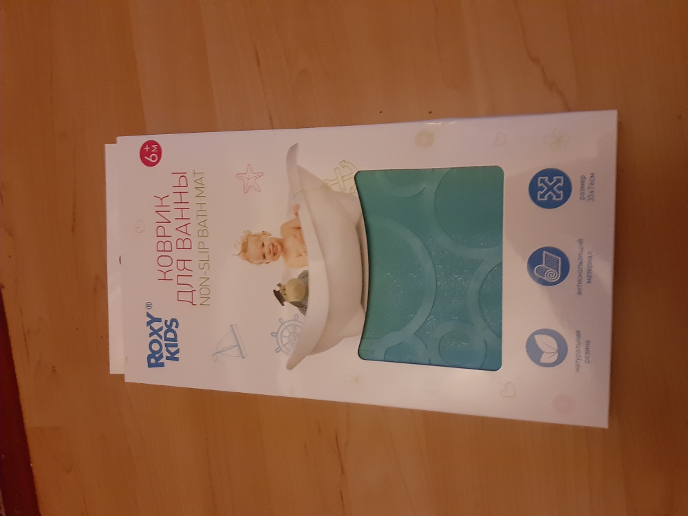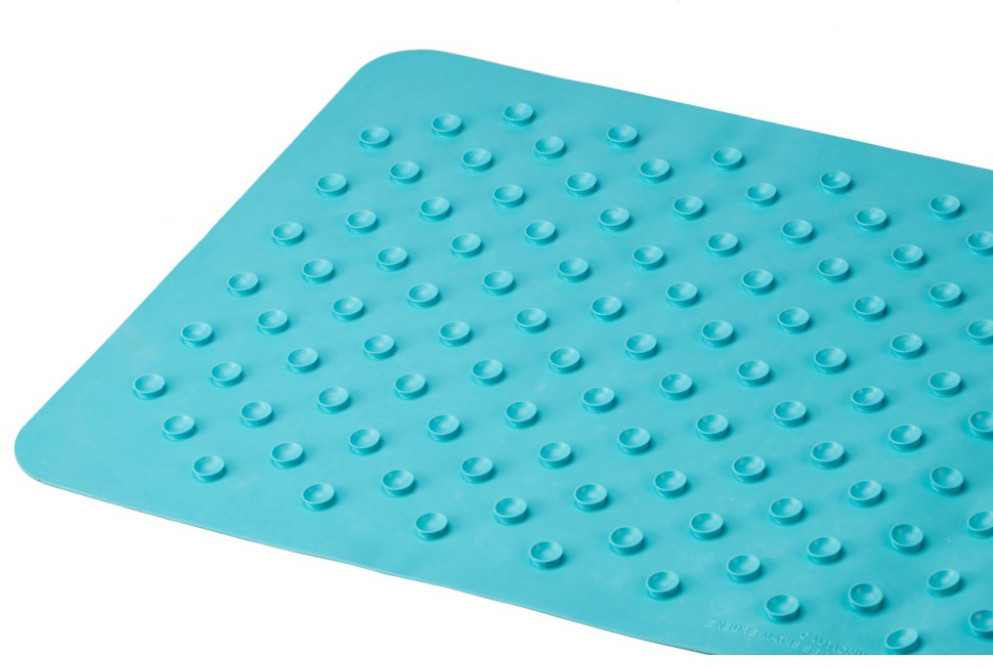 Коврик сочного бирюзового цвета, мягкий и действительно не скользит. Раньше был гелевый с дырочками,в нем всё застревало после мытья в ванне, но этот коврик гладкий, все с него слетает с водой и моется очень легко. Рекомендую.