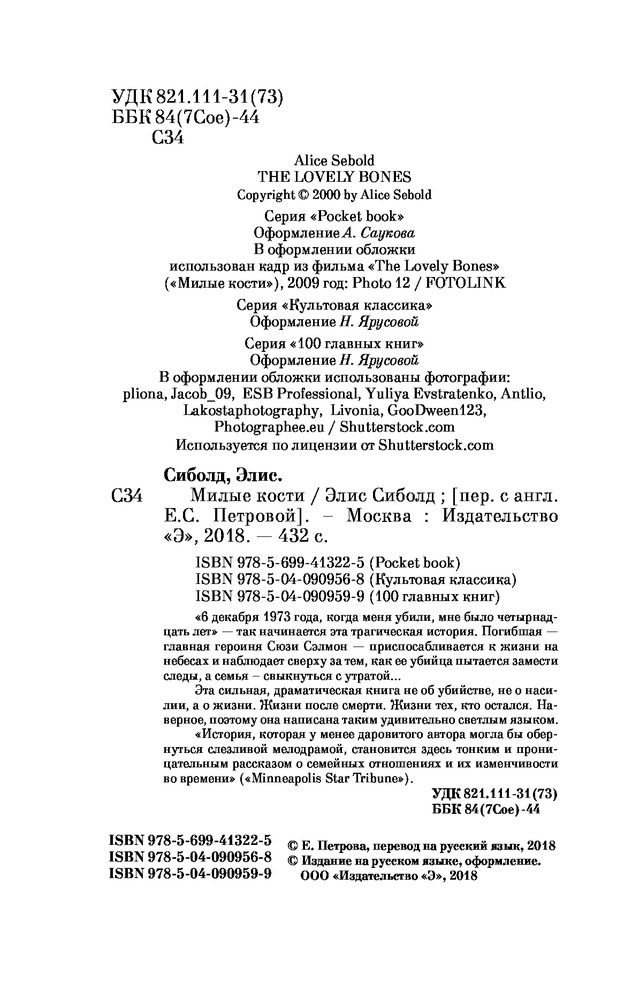 Милые костиВ данный момент этот товар отсутствует в продаже. Возможно, у нас найдется аналогичный или похожий товар здесь. «Шестого декабря тысяча девятьсот семьдесят третьего года, когда меня убили, мне было четырнадцать лет» — так начинается самый поразительный бестселлер начала XXI века, трагическая история, написанная на невероятно светлой ноте. «Милые кости» переведены на сорок языков, разошлись многомиллионным тиражом и послужат основой для следующего, после «Властелина колец» и «Кинг-Конга», кинопроекта Питера Джексона. В этом романе Сюзи Сэлмон приспосабливается к жизни на небесах и наблюдает сверху, как ее убийца пытается замести следы, а семья — свыкнуться с утратой… |
