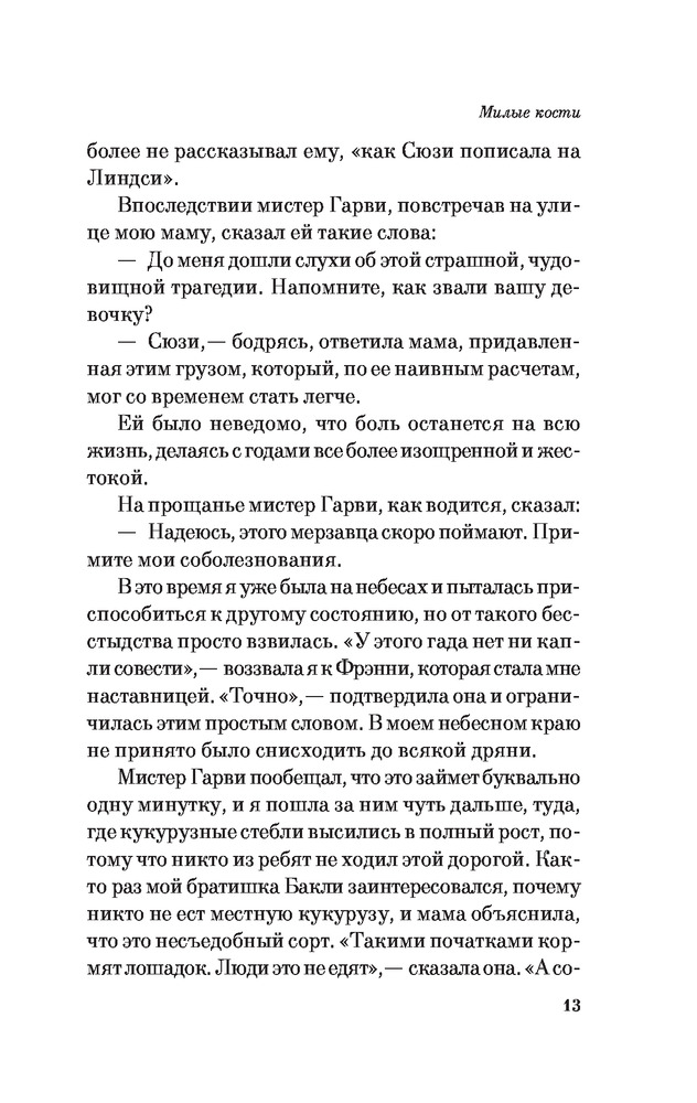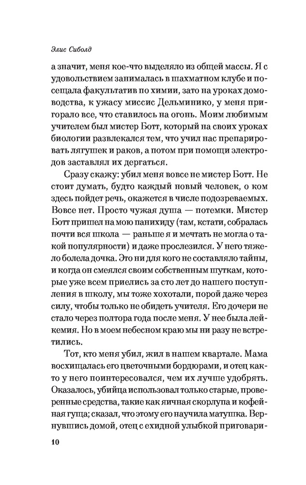 Печальная книга, повествование от имени погибшей девочки как бы вселяет веру, что ей теперь хорошо,- утешение для тех, кто пережил эту трагедию...жизнь продолжается. спасибо flip за качественный сервис )