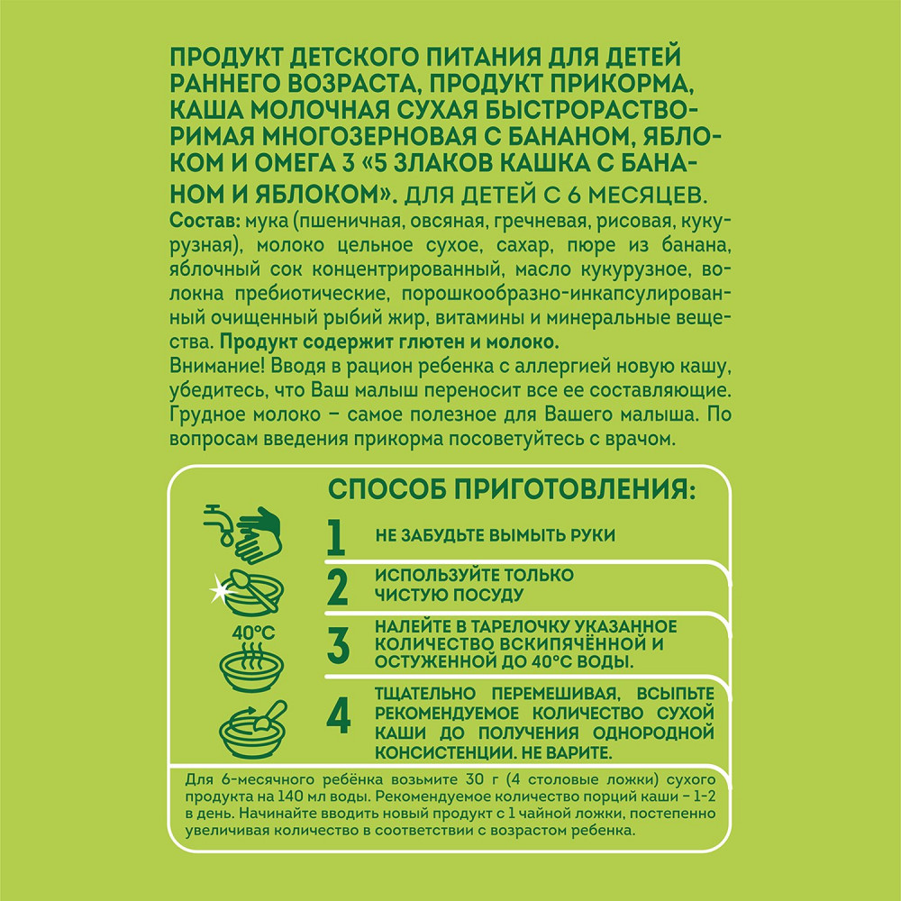 Heinz (Хайнц) Каша молочная злаковая с бананом и яблокомВ данный момент этот товар отсутствует в продаже. Возможно, у нас найдется аналогичный или похожий товар здесь. Серия: Молочная Фруктовые мультизлаковые каши Heinz с молоком и Омега-3 имеют высокую питательную ценность, поэтому отлично подходят для прикорма детей с 6 месяцев. В составе продукции — мука из 5 злаков, обогащенная кальцием, цинком, железом и другими минералами. Молочные злаковые каши отличаются высоким содержанием растительных белков, участвующих в построении мышц детского организма и стимулирующих обменные процессы. Омега-3 полиненасыщенные жирные кислоты в кашках Heinz способствуют развитию мозговых клеток, укрепляют иммунитет. Детские многозлаковые каши отличаются сбалансированной формулой. |