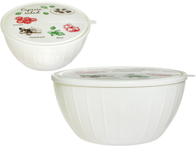 Купила 2-й, другого цвета, той же ёмкости - 2,8л. Нравится, что с крышкой, что пластмасса эластичная, гибкая, т.е., не хрупкая. Нравится что-нибудь в нём взбивать, замешивать тесто, мыть крупу, и прочее. Хотелось бы другие края у чашки - с бортиком, чтобы была опора, когда берёшь в руки, а то однажды, когда вынимала её из холодильника, она у меня выскользнула, и салат оказался на полу - и крышка не спасла - отскочила. А с другой стороны, в пластиковой посуде стараюсь не хранить пищу. Чашка имеет маркировку пластика на дне: № 5 (PP) – "полипропилен. Прочный и термостойкий. Из него изготавливают пищевые контейнеры, шприцы и детские игрушки. Сравнительно безопасен, но при некоторых обстоятельствах может выделять формальдегид".