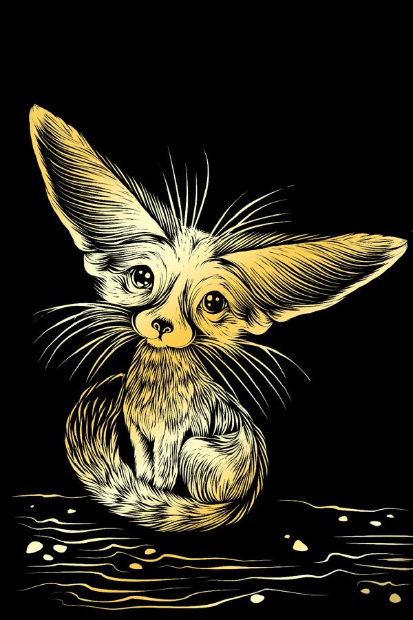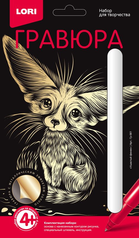 Гравюра — особый вид графического искусства. С гравюрой «Ушастый фенек» ребёнок может самостоятельно создать настоящее произведение искусства и почувствовать себя гравером. Контур изображения уже нанесен на черный фон. С помощью штихеля изображение процарапывается по контуру, и из-под слоя краски появляется блестящая основа. В результате получается контрастный рисунок с эффектным изображением.