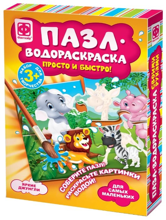 В красочной коробке лежит 4 фигурных детали из прочного картона. Части пазла плотно стыкуются друг с другом. Чтобы блеклые рисунки приобрели насыщенные цвета, поводите по ним мокрой кисточкой. После того как изображения высохнут, они, как и раньше, становятся светлыми. Раскрашивайте животных снова и снова!