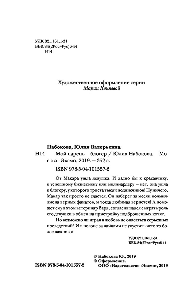 Мой парень — блогерВ данный момент этот товар отсутствует в продаже. Возможно, у нас найдется аналогичный или похожий товар здесь. Серия: Непременно счастливый финал От Макара ушла девушка. И ладно бы к красавчику, к успешному бизнесмену или миллиардеру — нет, она ушла к блогеру, у которого триста тысяч подписчиков! Ну ничего, Макар так просто не сдастся. Он наберет за месяц полмиллиона верных фанатов, и тогда любимая вернется! А поможет ему в этом ветеринар Варя, согласившаяся сыграть роль его девушки в обмен на пристройку подброшенных котят. Но возможно ли играя в любовь не опасаться серьезных последствий? И в погоне за лайками не упустить чего-то более важного? |