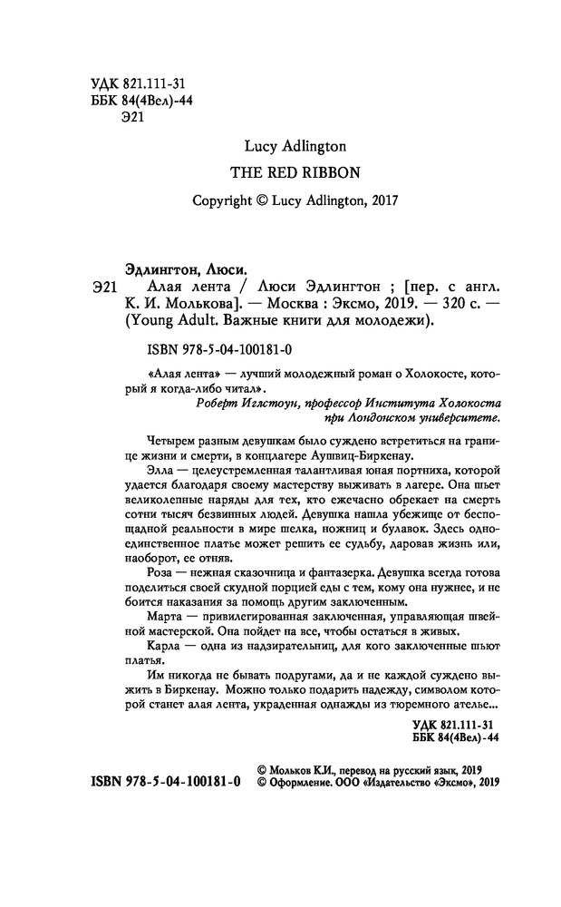 Алая лентаВ данный момент этот товар отсутствует в продаже. Возможно, у нас найдется аналогичный или похожий товар здесь. Серия: Young Adult. Важные книги для молодёжи «Алая лента» — лучший молодежный роман о Холокосте, который я когда-либо читал". Роберт Иглстоун, профессор Института Холокоста при Лондонском университете. Четырем разным девушкам было суждено встретиться на границе жизни и смерти, в концлагере Аушвиц-Биркенау. Элла — целеустремленная талантливая юная портниха, которой удается благодаря своему мастерству выживать в лагере. Она шьет великолепные наряды для тех, кто ежечасно обрекает на смерть сотни тысяч безвинных людей. Девушка нашла убежище от беспощадной реальности в мире шелка, ножниц и булавок. Здесь одно-единственное платье может решить ее судьбу, даровав жизнь или, наоборот, ее отняв. Роза — нежная сказочница и фантазерка. Девушка всегда готова поделиться своей скудной порцией еды с тем, кому она нужнее, и не боится наказания за помощь другим заключенным. Марта — привилегированная заключенная, управляющая швейной мастерской. Она пойдет на все, чтобы остаться в живых. Карла — одна из надзирательниц, для кого заключенные шьют платья. Им никогда не бывать подругами, да и не каждой суждено выжить в Биркенау. Можно только подарить надежду, символом которой станет алая лента, украденная однажды из тюремного ателье... |