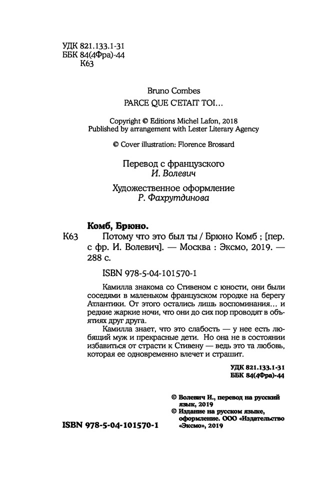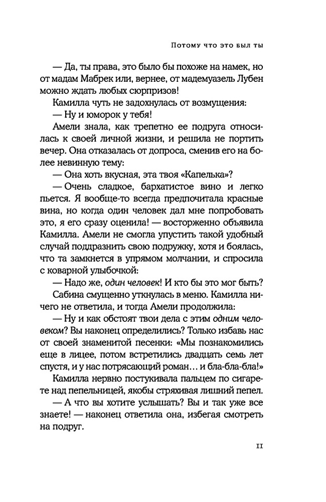 Потому что это был тыВ данный момент этот товар отсутствует в продаже. Возможно, у нас найдется аналогичный или похожий товар здесь. Серия: Самый сильный наркотик — любовь Камилла знакома со Стивеном с юности, они были соседями в маленьком французском городке на берегу Атлантики. От этого остались лишь воспоминания... и редкие жаркие ночи, что они до сих пор проводят в объятиях друг друга. Камилла знает, что это слабость — у нее есть любящий муж и прекрасные дети. Но она не в состоянии избавиться от страсти к Стивену — ведь это та любовь, которая ее одновременно влечет и страшит. |