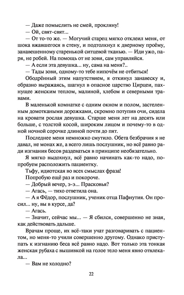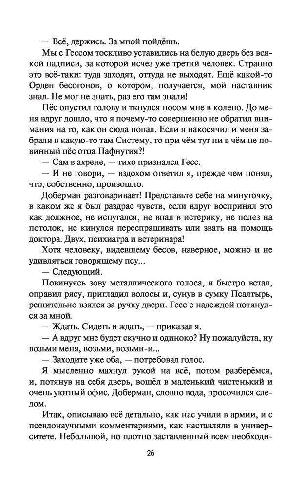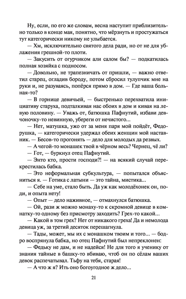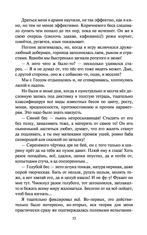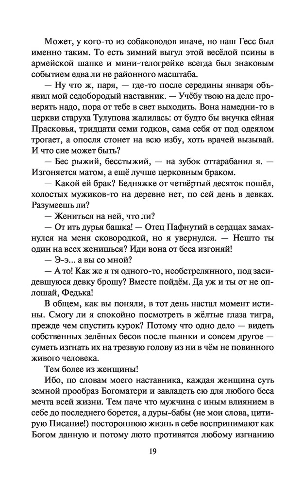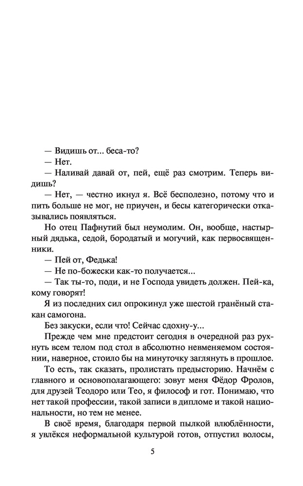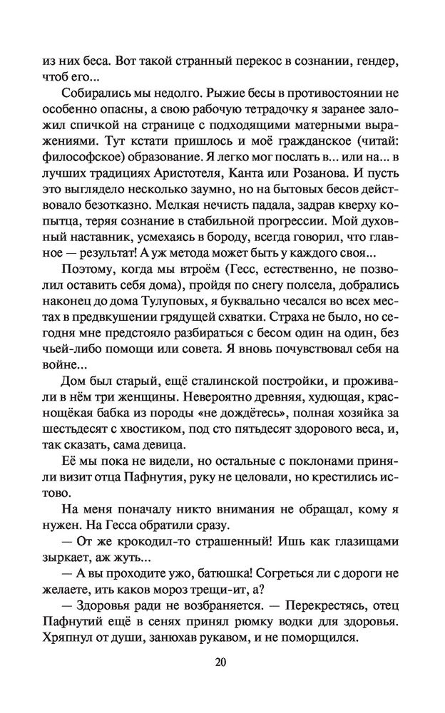 В данный момент этот товар отсутствует в продаже. Возможно, у нас найдется аналогичный или похожий товар здесь. Серия: Фантастический боевик Если в душе ты — гот, по образованию — философ, по воинской специальности — снайпер и до сих пор ищешь себя, бросай всё, езжай на русский Север! В заснеженном селе под Архангельском найди могучего отца Пафнутия, и если сумеешь устоять на ногах, так быть тебе в тайном Ордене бесогонов...Это значит: крест на шею, молитвенник в руки, фляжку святой воды за пазуху, револьвер с серебряными пулями в карман — и вперёд, за странным доберманом по кличке Гесс! Честный, верный, болтливый! Система таких любит.