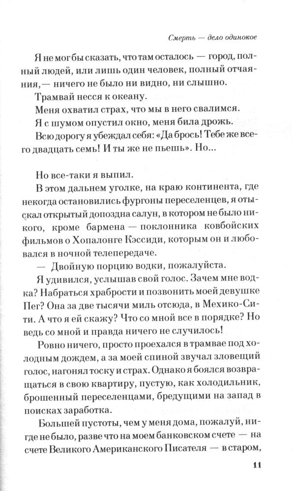 Смерть - дело одинокоеВ данный момент этот товар отсутствует в продаже. Возможно, у нас найдется аналогичный или похожий товар здесь. Серия: Pocket Book (обложка) 1949 год. Венеция, штат Калифорния. "Американские горки" разобраны на металлолом. Кинотеатр на пирсе пуст и заколочен. В львиной клетке, затопленной в канале, находят мертвое тело. Первое из многих... Все склонны считать, что никакой связи между смертями нет. Кроме детектива Элмо Крамли и странного молодого человека, целыми днями просиживающего за пишущей машинкой и рассылающего свои рассказы в журналы "Черная маска", "Сверхъестественные истории", "Мадмуазель". |