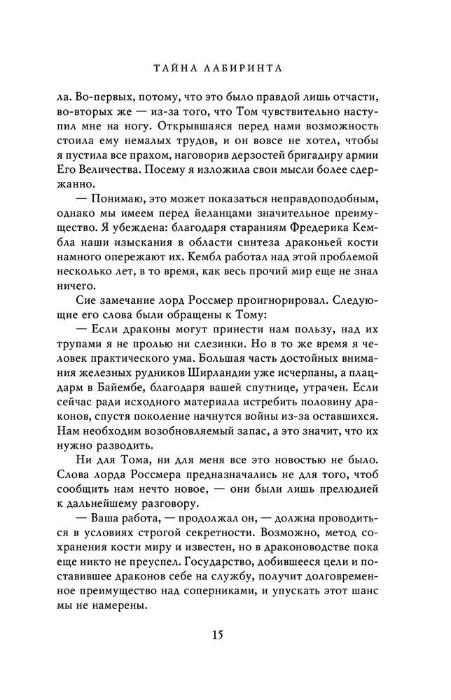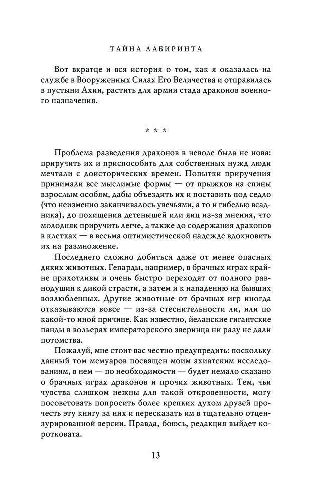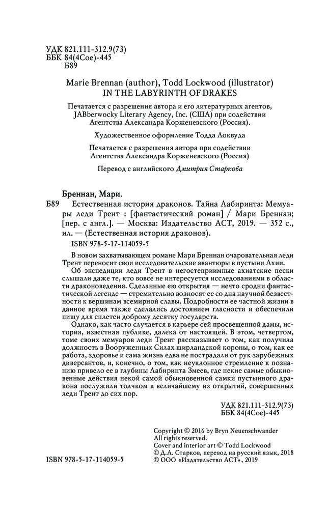 Тайна ЛабиринтаВ данный момент этот товар отсутствует в продаже. Возможно, у нас найдется аналогичный или похожий товар здесь. Серия: Естественная история драконов В новом захватывающем романе Мари Бреннан очаровательная леди Трент переносит свои исследовательские авантюры в пустыни Ахии. Об экспедиции леди Трент в негостеприимные ахиатские пески слышали даже те, кто вовсе не интересуется исследованиями в области драконоведения. Сделанные ею открытия — нечто сродни фантастической легенде — стремительно возносят ее со дна научной безвестности к вершинам всемирной славы. Подробности ее частной жизни в данное время также сделались достоянием гласности и обеспечили пищу для сплетен доброму десятку государств. Однако, как часто случается в карьере сей просвещенной дамы, история, известная публике, далека от настоящей. В этом, четвертом, томе своих мемуаров леди Трент рассказывает о том, как получила должность в Вооруженных Силах ширландской короны, о том, как ее работа, здоровье и сама жизнь едва не пострадали от рук зарубежных диверсантов, и, конечно, о том, как неуклонное стремление к познанию привело ее в глубины Лабиринта Змеев, где некие самые обыкновенные действия некой самой обыкновенной самки пустынного дракона послужили толчком к величайшему из открытий, совершенных леди Трент до сих пор. |