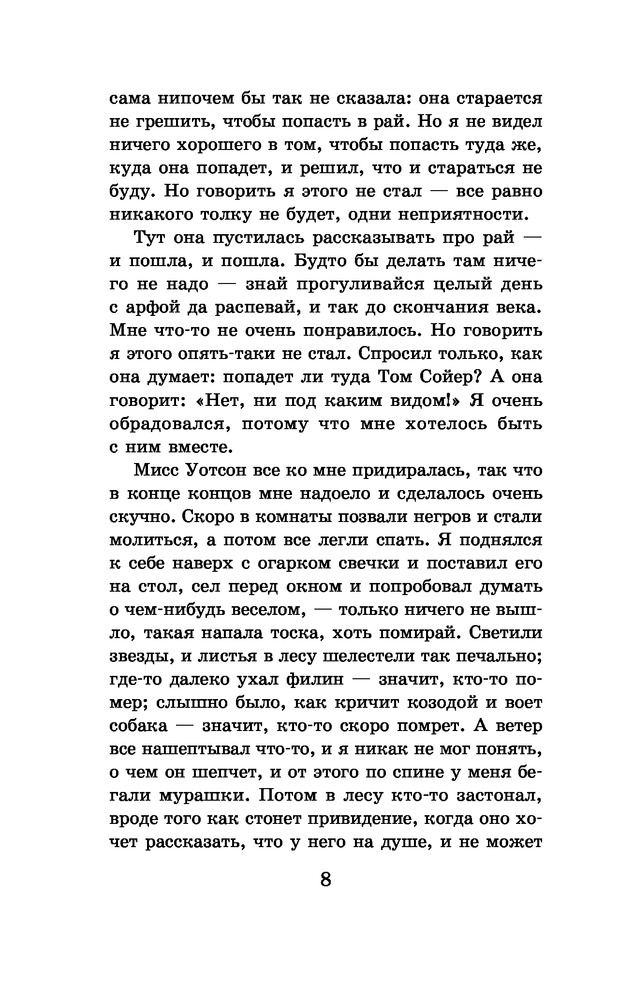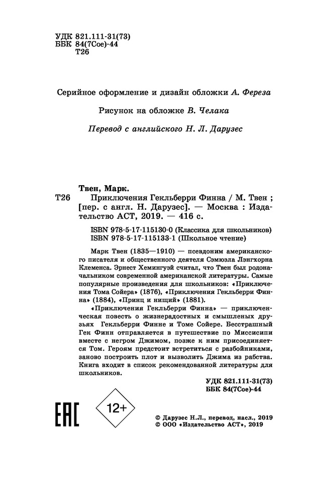 Серия: Классика для школьников Марк Твен (1835-1910) — псевдоним американского писателя и общественного деятеля Сэмюэла Лэнгхорна Клеменса. Эрнст Хемингуэй считал, что Твен был родоначальником современной американской литературы. Самые популярные произведения для школьников: «Приключения Тома Сойера» (1876), «Приключения Гекльберри Финна» (1884), «Принц и нищий» (1881). «Приключения Гекльберри Финна» — приключенческая повесть о жизнерадостных и смышленых друзьях Гекльберри Финне и Томе Сойере. Бесстрашный Гек Финн отправляется в путешествие по Миссисипи вместе с негром Джимом, позже к ним присоединяется Том. Героям предстоит встретиться с разбойниками, заново построить плот и вызволить Джима из рабства. Книга входит в список рекомендованной литературы для школьников. |