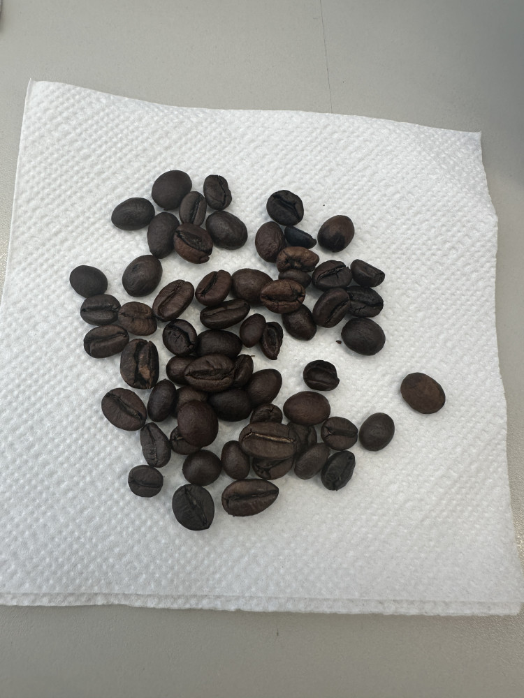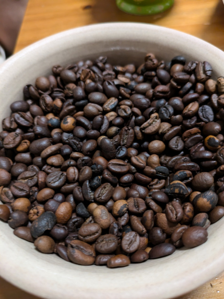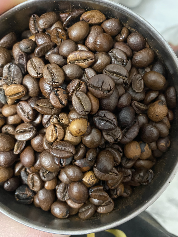 Разные зерна и по степени обжарки и по размеру. Пережаренная рабуста. Много пустых обломков от зёрен. Кофейного аромата нет совсем!