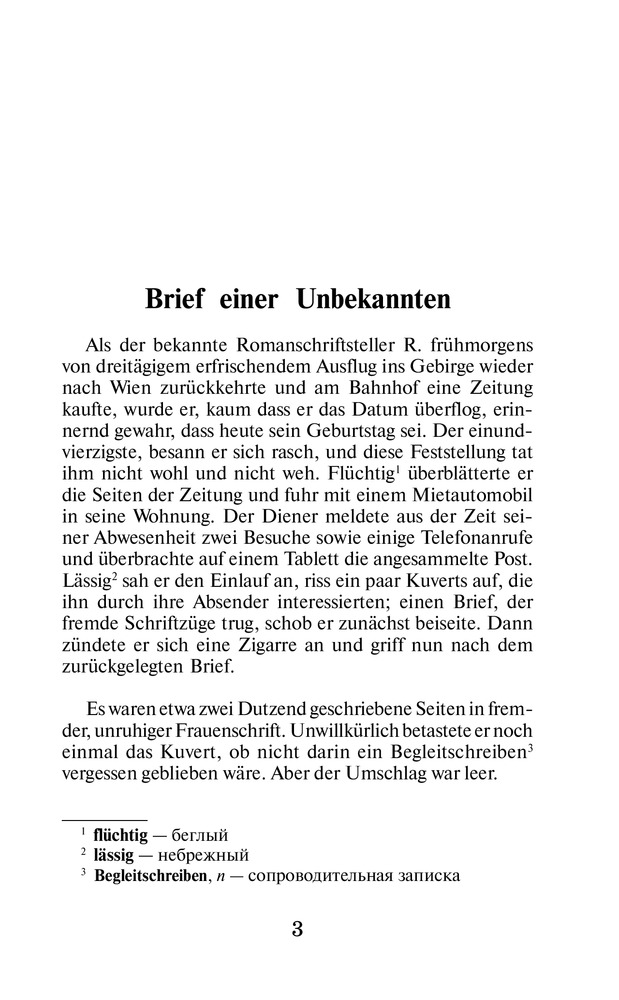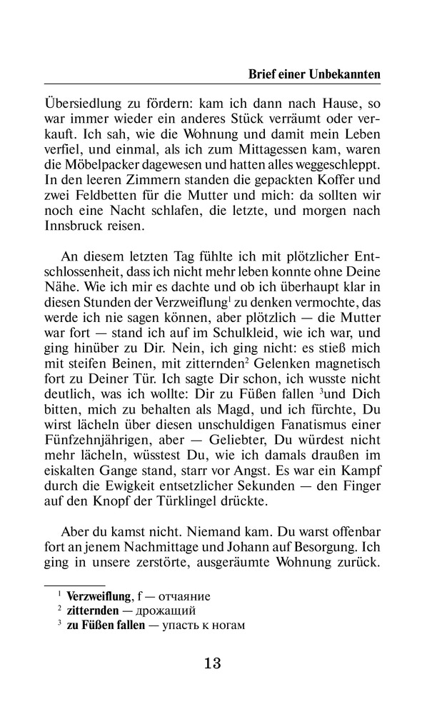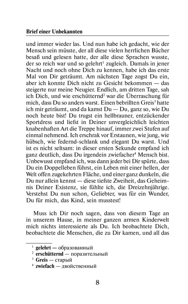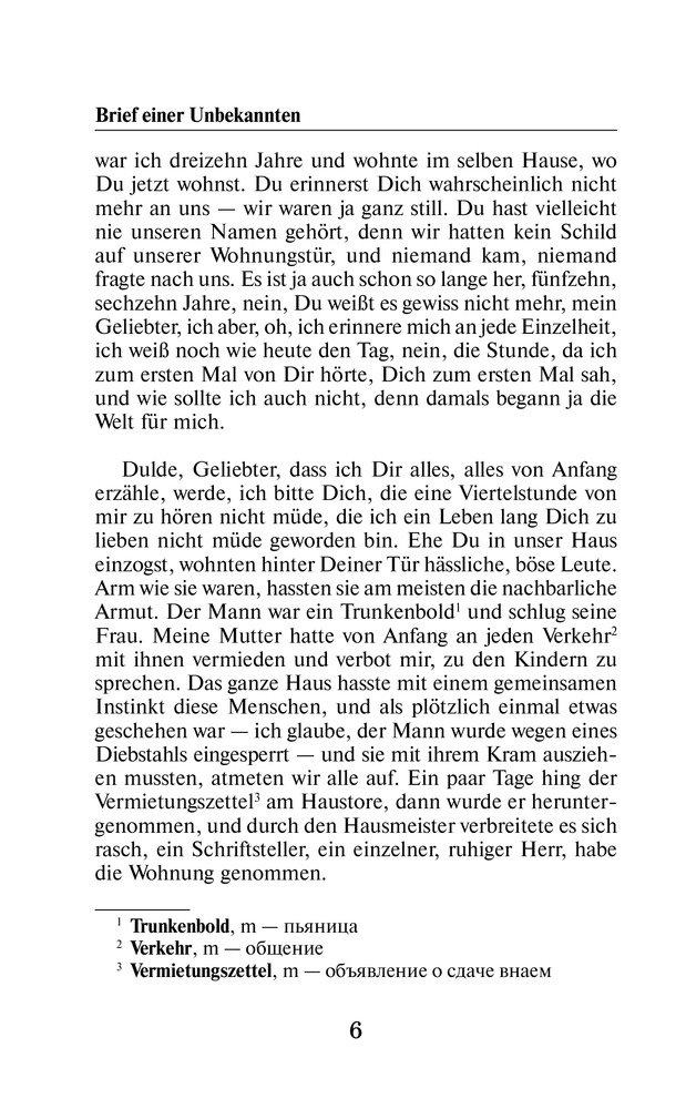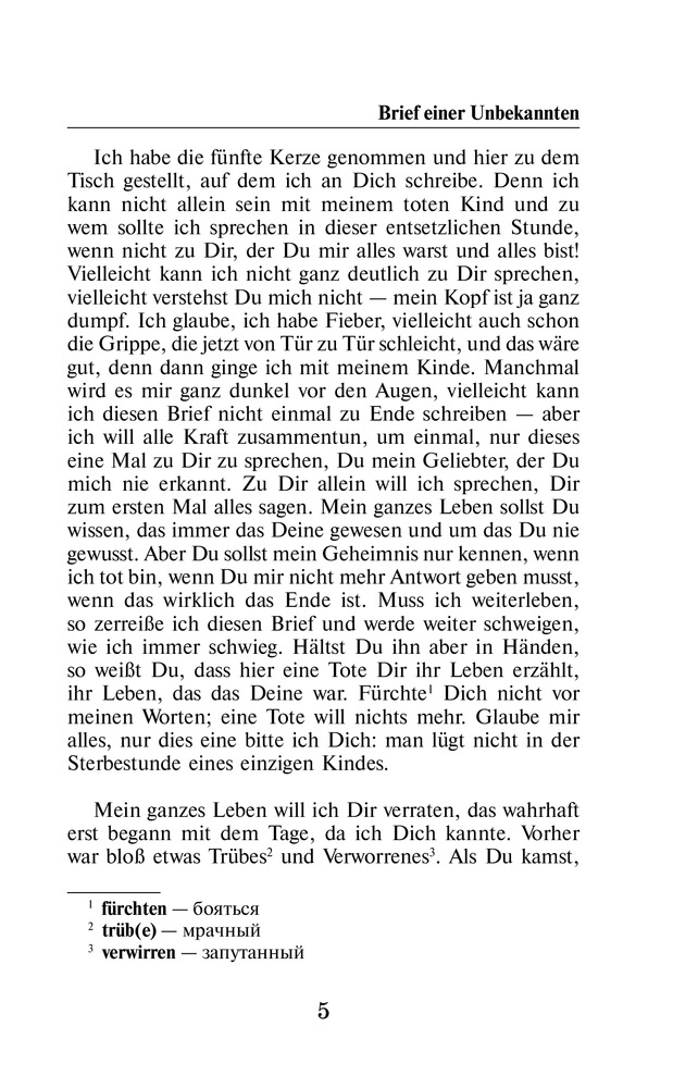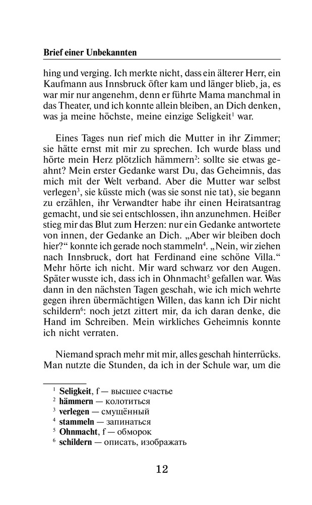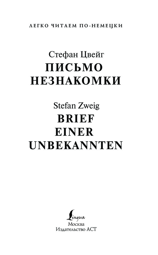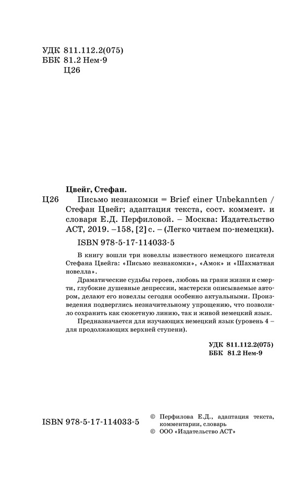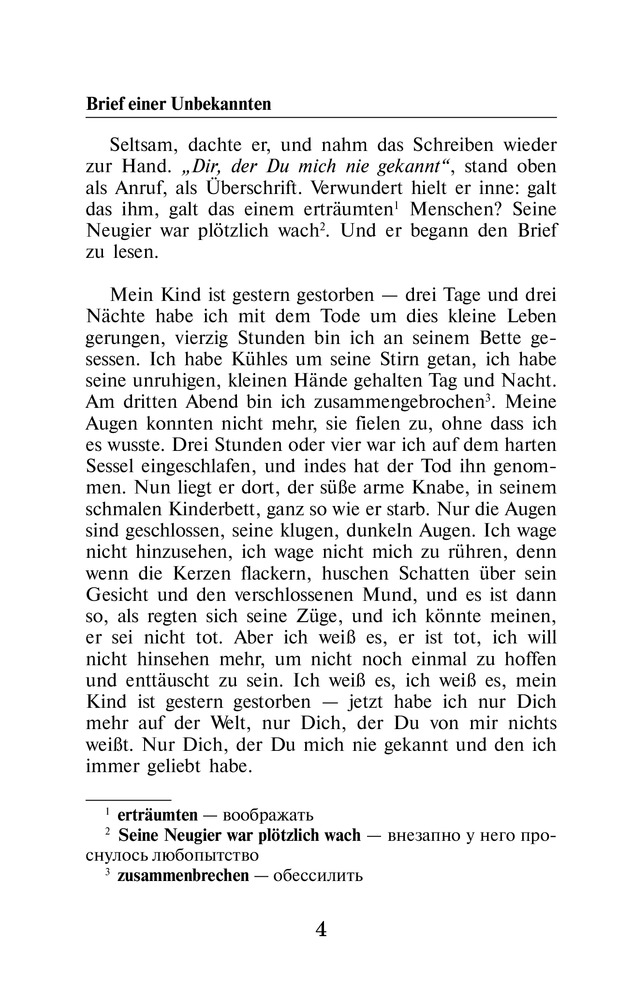 Письмо незнакомки. Уровень 4В данный момент этот товар отсутствует в продаже. Возможно, у нас найдется аналогичный или похожий товар здесь. Серия: Легко читаем по-немецки В книгу вошли три новеллы известного немецкого писателя Стефана Цвейга: «Письмо незнакомки», «Амок» и «Шахматная новелла». Драматические судьбы героев, любовь на грани жизни и смерти, глубокие душевные депрессии, мастерски описываемые автором, делают его новеллы сегодня особенно актуальными. Произведения подверглись незначительному упрощению, что позволило сохранить как сюжетную линию, так и живой немецкий язык. Предназначается для изучающих немецкий язык (уровень 4 — для продолжающих верхней ступени). |