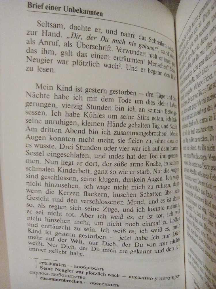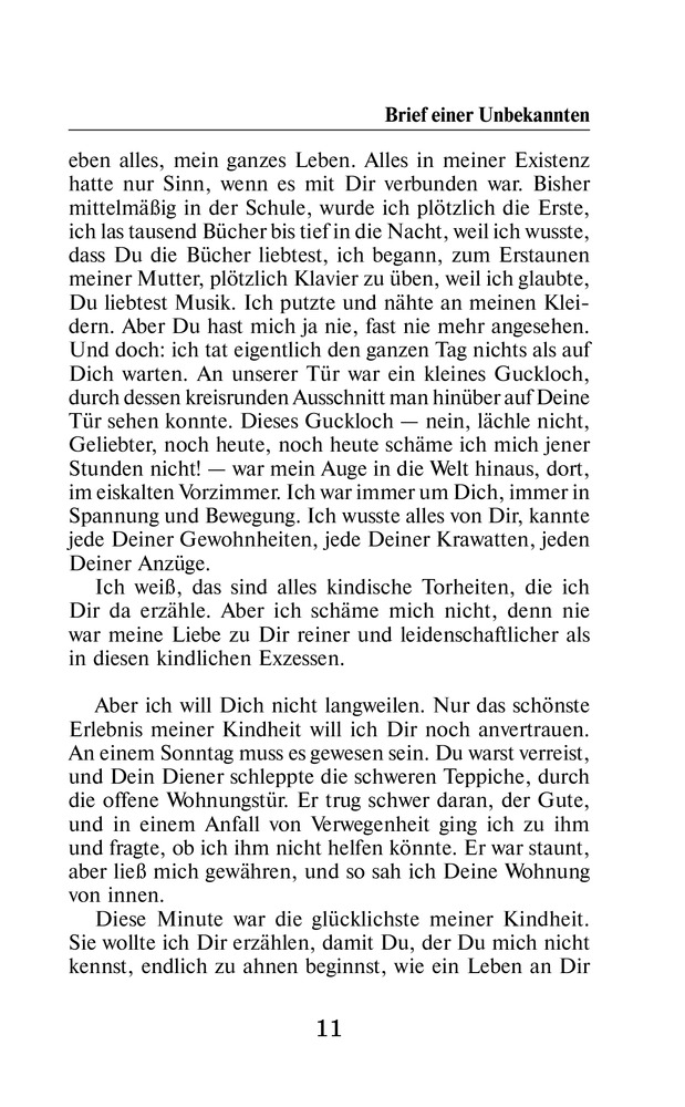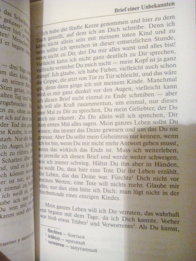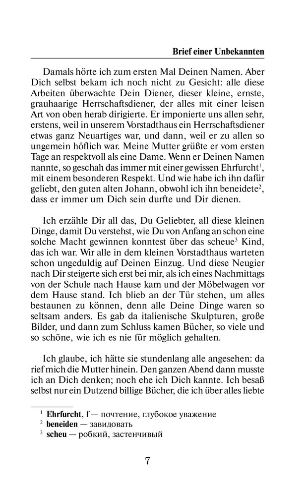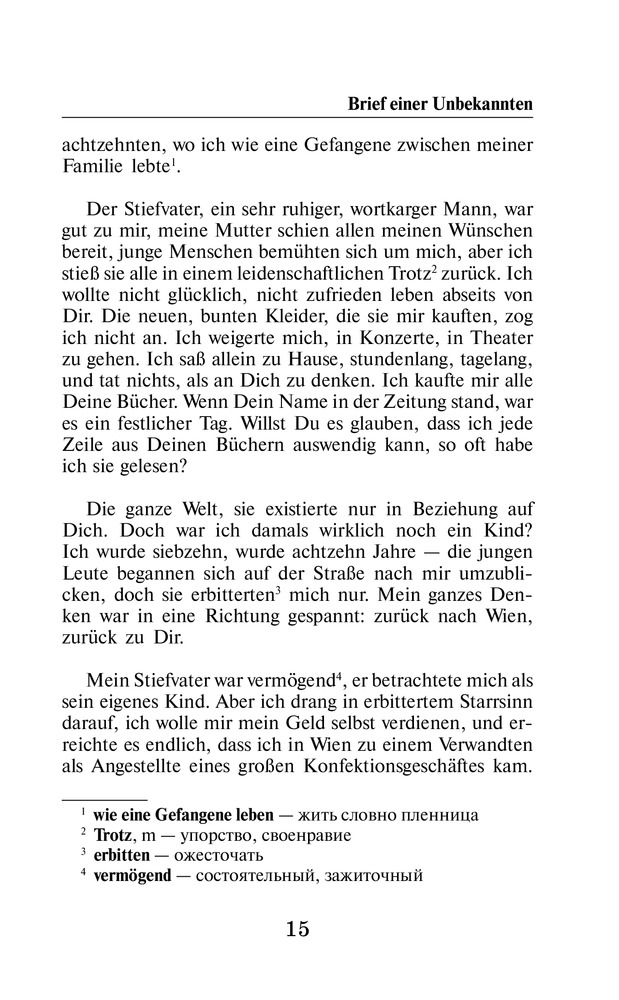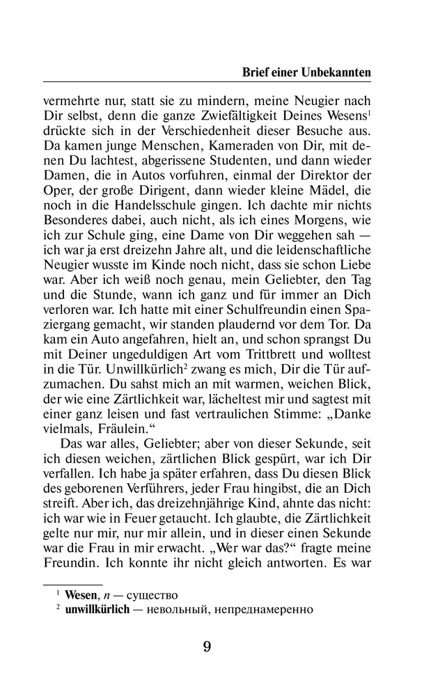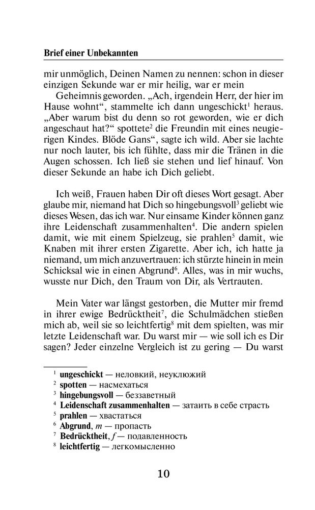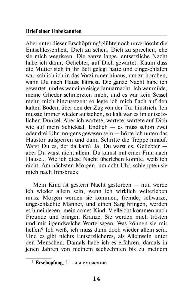 Письмо незнакомки. Уровень 4В данный момент этот товар отсутствует в продаже. Возможно, у нас найдется аналогичный или похожий товар здесь. Серия: Легко читаем по-немецки В книгу вошли три новеллы известного немецкого писателя Стефана Цвейга: «Письмо незнакомки», «Амок» и «Шахматная новелла». Драматические судьбы героев, любовь на грани жизни и смерти, глубокие душевные депрессии, мастерски описываемые автором, делают его новеллы сегодня особенно актуальными. Произведения подверглись незначительному упрощению, что позволило сохранить как сюжетную линию, так и живой немецкий язык. Предназначается для изучающих немецкий язык (уровень 4 — для продолжающих верхней ступени). |