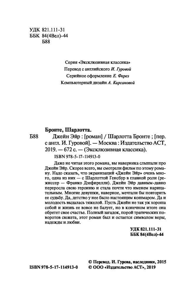 💳 Оплатить за товар можно при получении 🇰🇿 Есть бесплатная доставка по Казахстану от 1 дня 🎁 Копите бонусы с каждой покупки Серия: Эксклюзивная классика (Лучшее) Даже не читая этого романа, вы наверняка слышали про Джейн Эйр. Скорее всего, вы смотрели фильм по этому роману. Надо сказать, что экранизаций «Джейн Эйр» очень много, одна из них — с Шарлоттой Генсбур в главной роли (режиссер — Франко Дзефирелли). Джейн Эйр давным-давно переросла свою героиню и стала почти что именем нарицательным. Многие девушки, наверное, мечтали бы повторить ее судьбу. Да, детство у нее было настоящим кошмаром. Да и молодость выдалась тяжелой. Пусть Джейн не так уж хороша собой, и жизнь ее вовсе не балует, но в конечном итоге она обретет свое счастье. Полный загадок, порой трагических поворотов сюжета, этот роман был и остается символом веры, надежды и любви. |