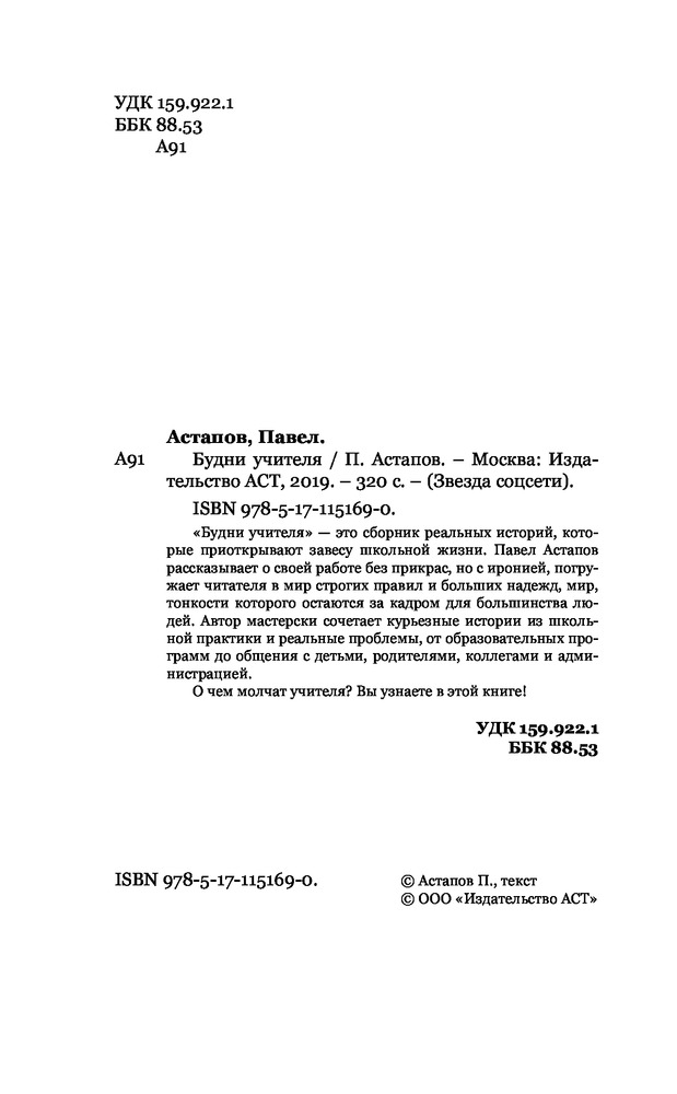 Будни учителяВ данный момент этот товар отсутствует в продаже. Возможно, у нас найдется аналогичный или похожий товар здесь. Серия: Звезда соцсети «Будни учителя» — это сборник реальных историй, которые приоткрывают завесу школьной жизни. Павел Астапов рассказывает о своей работе без прикрас, но с иронией, погружает читателя в мир строгих правил и больших надежд, мир, тонкости которого остаются за кадром для большинства людей. Автор мастерски сочетает курьезные истории из школьной практики и реальные проблемы — от образовательных программ до общения с детьми, родителями, коллегами и администрацией. О чём молчат учителя? Вы узнаете в этой книге! |